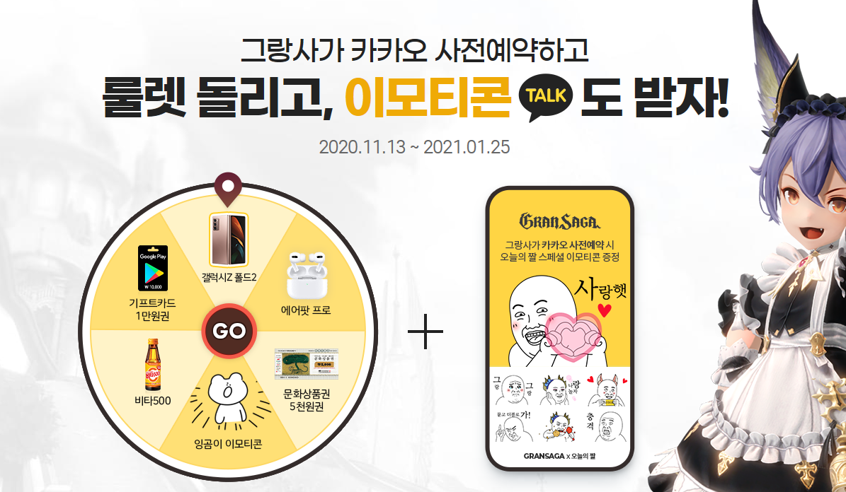 그랑사가 카카오 사전예약을 진행할 경우 룰렛이벤트 참여도 가능합니다. 특히 그랑사사 사전예약시 오늘의 쫠 스폐셜 이모티콘을 받을 수 있어 활용하면 좋을 것 같습니다. 룰렛이벤트의 경우에도 갤럭시Z폴드2와 에어팟 프로, 구글기프트카드 1만원권등 다양한 선물이 준비되어 있어 놓치면 안되겠지요?