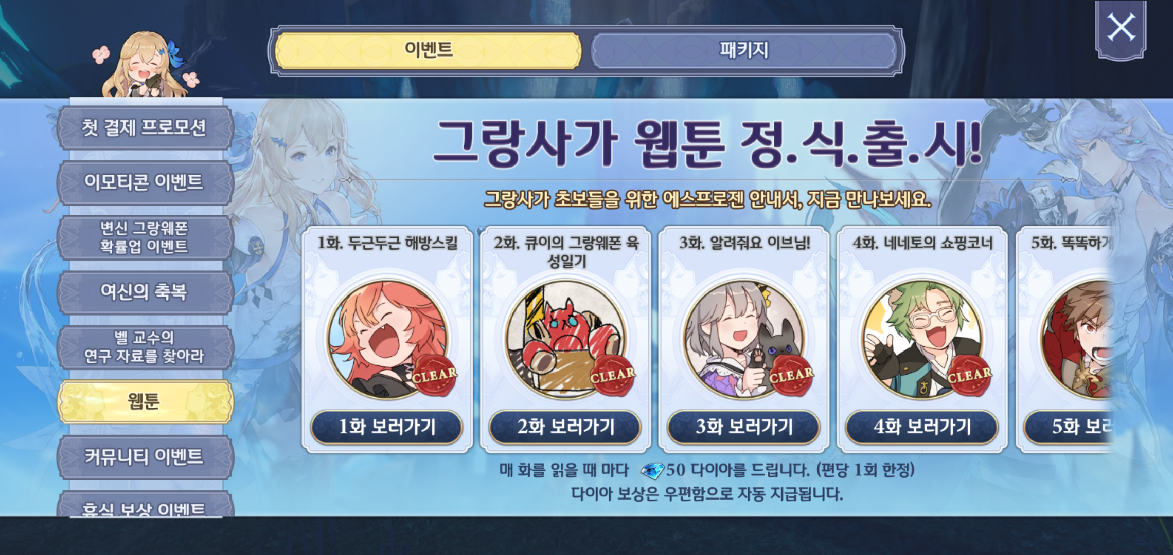 그랑사가에서 진행되는 이벤트도 다양해 이를 활용하는 것도 빼 놓을 수 없습니다. 파자마 그녀 콜라보 이벤트를 통해 무료 이모티콘을 획득할 수 있고, 웹툰 출시에 따라 매화를 읽을 때 마다 다이아를 추가로 증정 받을 수 있습니다. 여기에 공식커뮤니티에 가입하면 받을 수 있는 보상도 상당하구요.