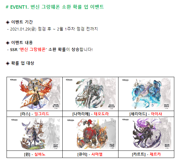 그랑사가 공략에 있어 꼭 챙겨야 하는 그랑웨폰 소환확률 이벤트도 진행 중입니다. SSR등급 그랑웨폰 소환 확률을 2월 1주차 점검까지 진행하고, 기사단 블랙 등록증 혜택을 1주일간 적용받을 수 있는 이벤트가 진행 중인만큼 서둘러 접속해 받아야 모든 혜택을 챙기시는걸 추천드립니다.