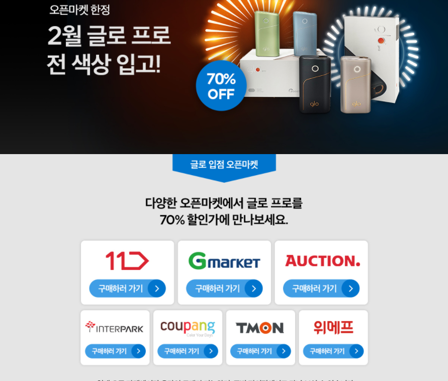 디자인부터 기능, 관리에 이르기까지 모든 장점을 다 갖춘 글로 프로. 현재 글로 프로 1주년 이벤트가 진행 중입니다. 먼저 다양한 오픈마켓에서 글로 프로를 70% 할인가격에 구매 가능한데요, 11번가를 비롯한 G마켓, 옥션 등에서 원하는 색상의 글로 프로를 할인된 가격으로 구매할 수 있습니다.