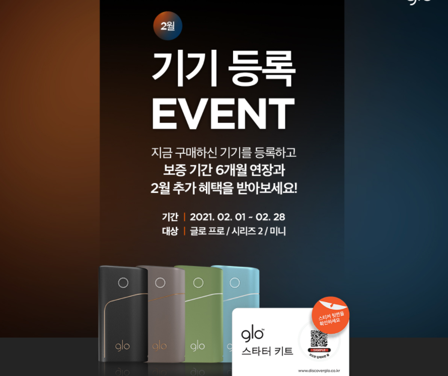 할인 행사 외에도 공식 홈페이지에서 구매한 기기를 등록하면 제품보증 기간이 6개월 연장됩니다. 여기에 추첨을 통해 LG 퓨리케어 미니 공기청정기를 증정하는 이벤트도 열리고 있는데요, 70% 할인에 제품보증 기간 연장까지 더해진 지금 전자담배 구매를 망설이는 분들에게는 최적의 조건이 아닐까 싶습니다. 이외에 글로 카카오톡 채널을 친구 추가하면 다양한 제품 프로모션 소식을 누구보다 빠르게 받아볼 수 있으니, 아직 친구추가가 안 된 분들이라면 서둘러 추가하고, 발 빠른 글로 프로모션 소식들을 접해보시기 바랍니다!