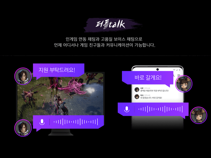모험을 즐기는 데 있어 좋은 친구들과 동료들은 즐거움을 더해주기도 하는데요, 퍼플 앱플레이어를 활용하면 인게임 연동 채팅은 기본, 고품질 보이스 채팅으로 소통할 수 있어 언제 어디서든 친구들과 함께 커뮤니케이션할 수 있습니다. 별도의 보이스채팅 앱이 필요 없을 정도로 말이죠.