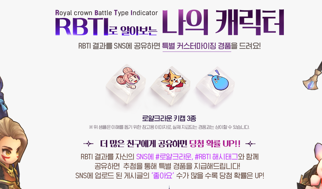 RBTI로 알아보는 나의캐릭터 이벤트도 진행 중입니다. RBTI에 참여하고, 결과를 SNS에 공유하는 방식으로 간단히 참여하고 선물을 받을 수 있는 이벤트인데요, SNS공유시 #로얄크라운, #RBTI 해시태그를 함께 공유하면 추첨을 통해 특별 커스터마이징 경품을 받을 수 있습니다.