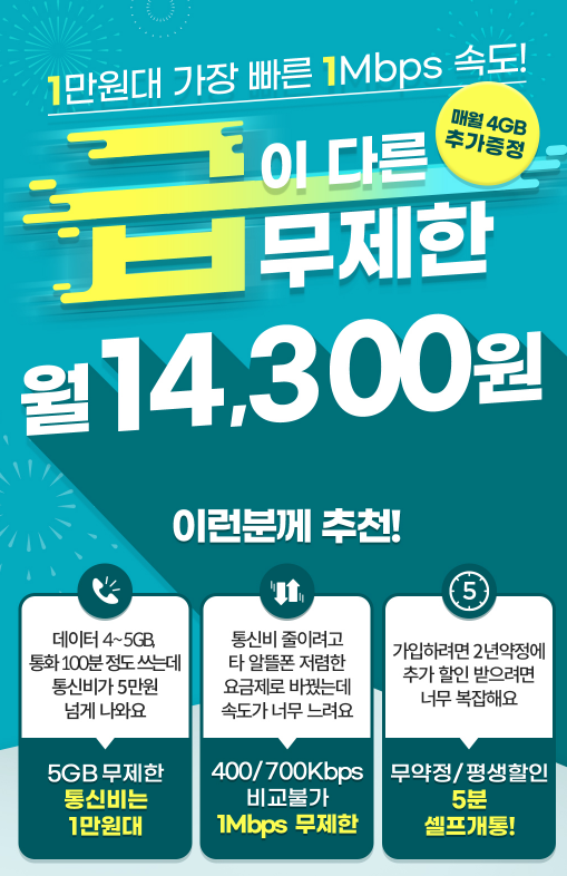 데이터무제한 요금제를 사용할 경우에도 Kt엠모바일 알뜰폰의 요금제는 타사와 비교해도 전혀 손색이 없을 정도 입니다. 먼저 월 14,300원으로 5GB의 데이터를 사용할 수 있고, 속도 역시 1Mbps 무제한으로 제공됩니다. 여기에 별다른 약정 없이 무약정으로 평생할인 받아 1만원대 통신비로 사용할 수 있는 점도 빼 놓을 수 없는 부분입니다.
