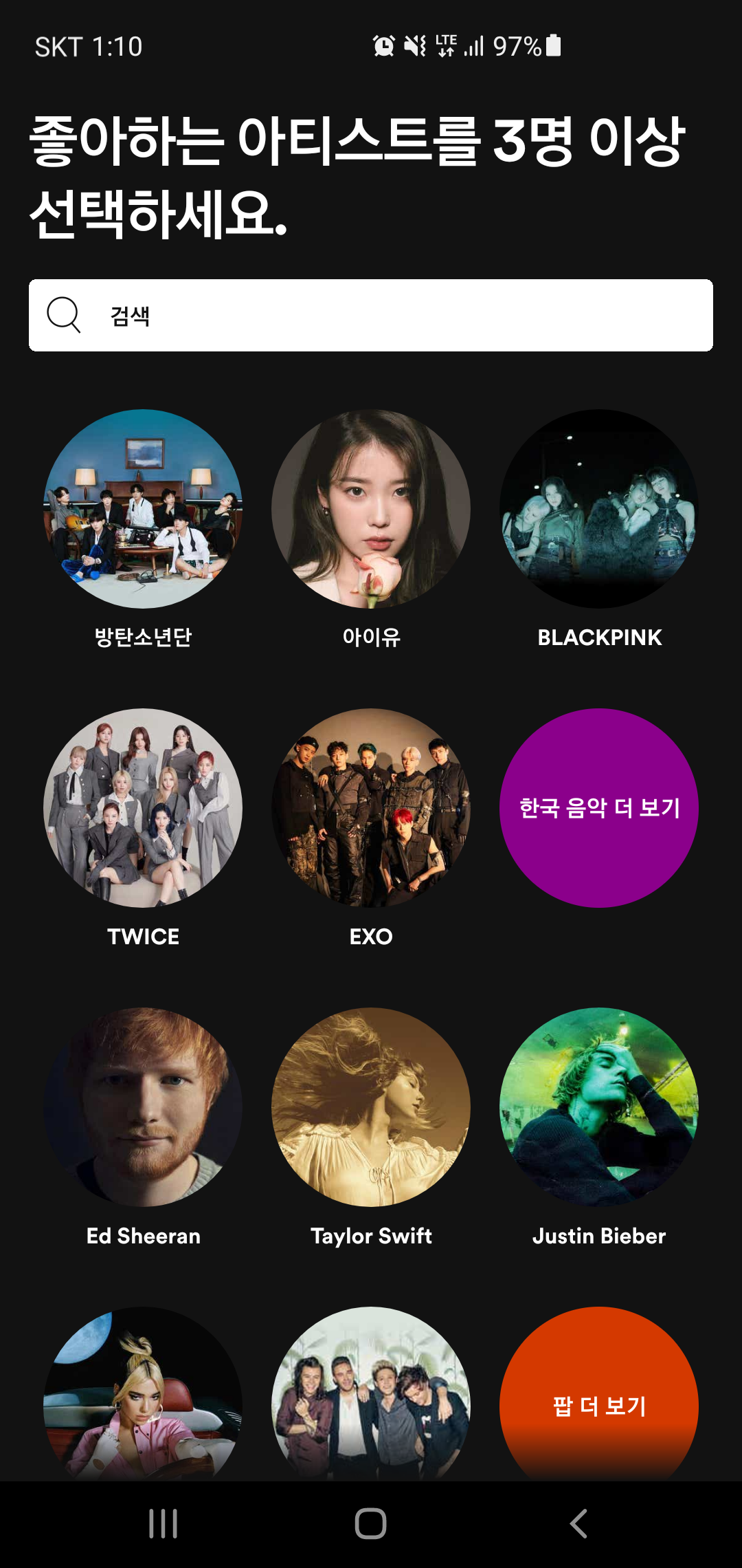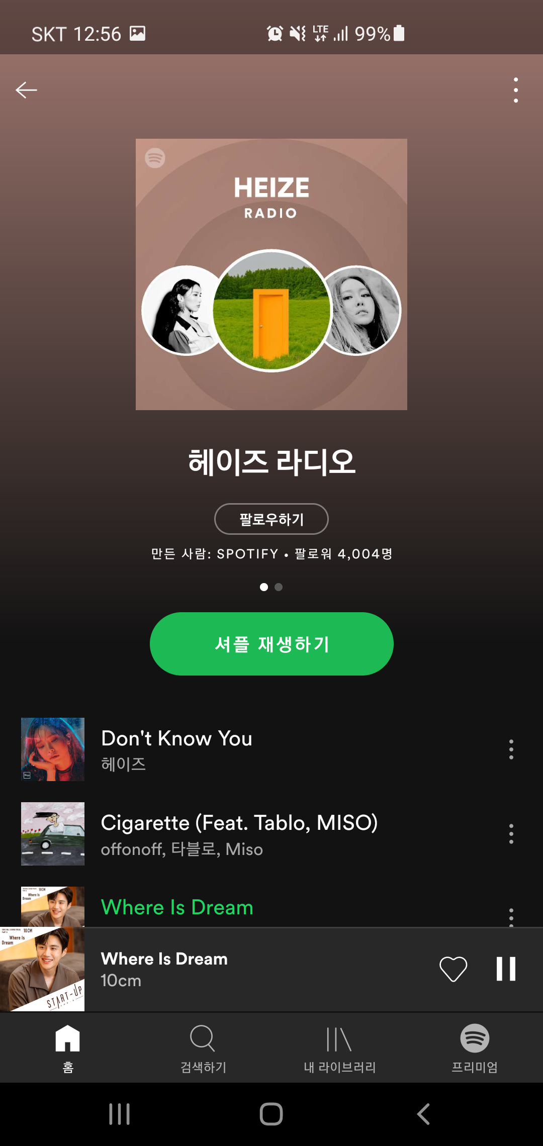 특히 스포티파이를 처음 시작할 때 좋아하는 아티스트를 3명 이상 선택할 수 있는 항목이 있었는데요, 이는 곧 스포티파이를 시작함과 동시에 선택한 가수와 비슷한 성향의 노래들로 가득찬 플레이라디오로 구성되었습니다. 플레이리스트를 살펴보니 미처 몰랐던 노래부터 익히 알고 있는 노래까지 다양하게 구성되어 있더군요.