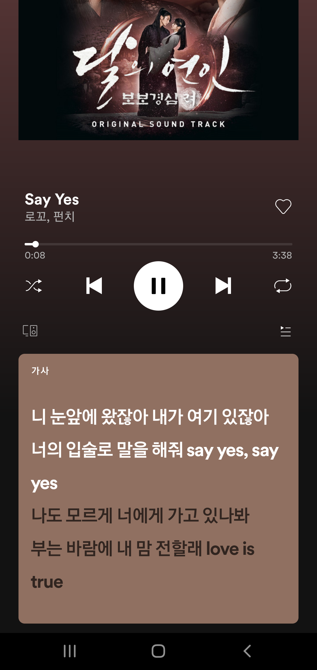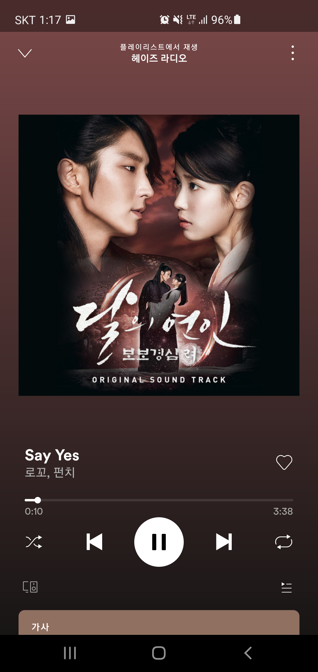 재생 화면에 있어서도 자동반복재생이나 랜덤재생등 기본적인 기능들은 모두 갖추고 있었습니다. 앨범 자켓 사진과 가사도 빠짐 없이 구성되어 있어 음악을 듣던 중 마음에 드는 노래가 있다면 좋아요 표시를 하거나 해당 곡만 반복적으로 들을 수 있기도 합니다.