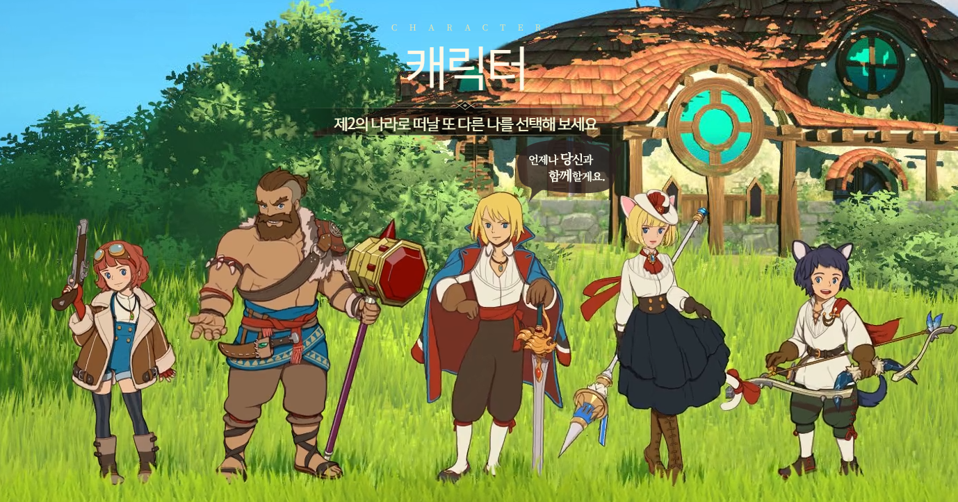 제2의 나라 공식 홈페이지에는 함께 모험을 진행할 캐릭터 5인에 대한 정보도 공개되었습니다. 사수/ 전사/ 검사/ 마술사/ 궁수 다섯 가지 직업으로 구성되어 있는데요, 각각의 직업에 따른 특징도 다르고, 개성도 달라 어떤 직업을 선택하면 좋을지 벌써 고민을 하게 만들었습니다.