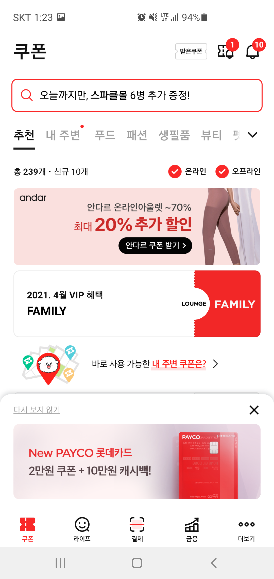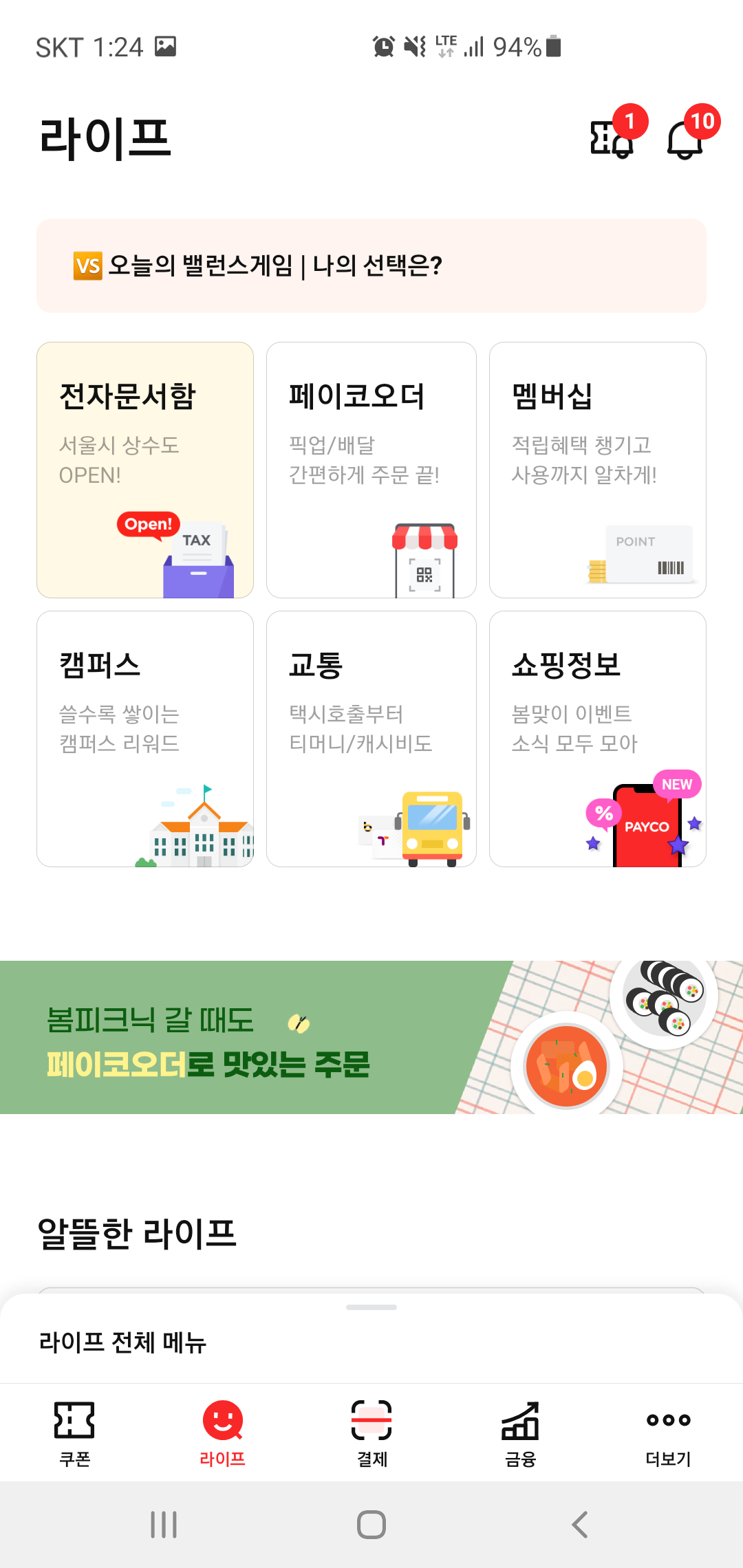페이코에 접속하면 단순히 결제 뿐만 아니라 사용 가능한 쿠폰이라던가 혜택등을 확인할 수 있습니다. 쿠폰도 등급에 따라 여러 혜택이 주어지고, 쇼핑 정보다 교통, 캠퍼스 리워드등 다양한 활용이 가능합니다. 그리고 지금 꼭 챙겨야 할 것이 있다면 라이프 채널 상단에 보이는 밸런스 퀴즈인데요, 퀴즈도 풀고 혜택도 받을 수 있어 놓치면 안될 이벤트입니다.