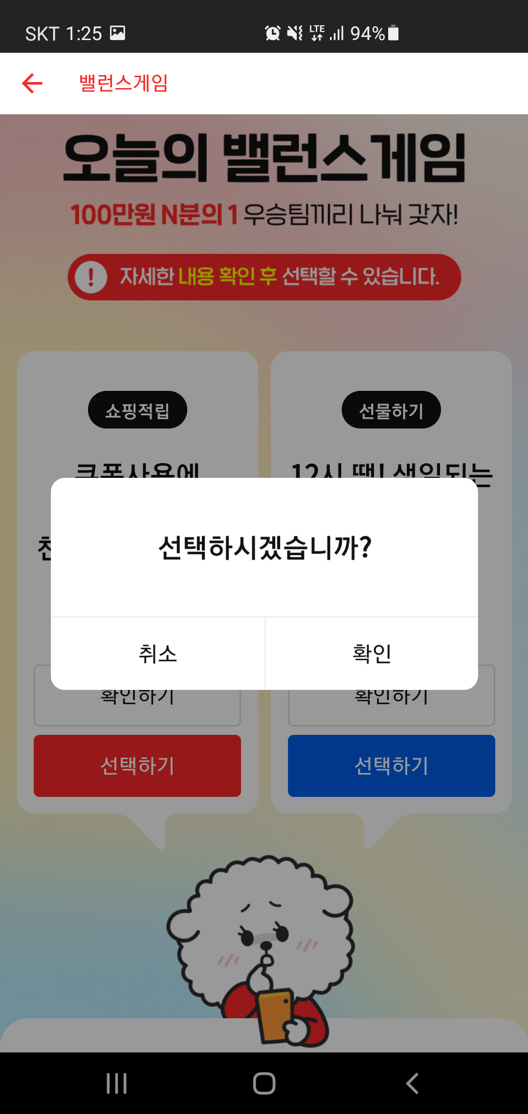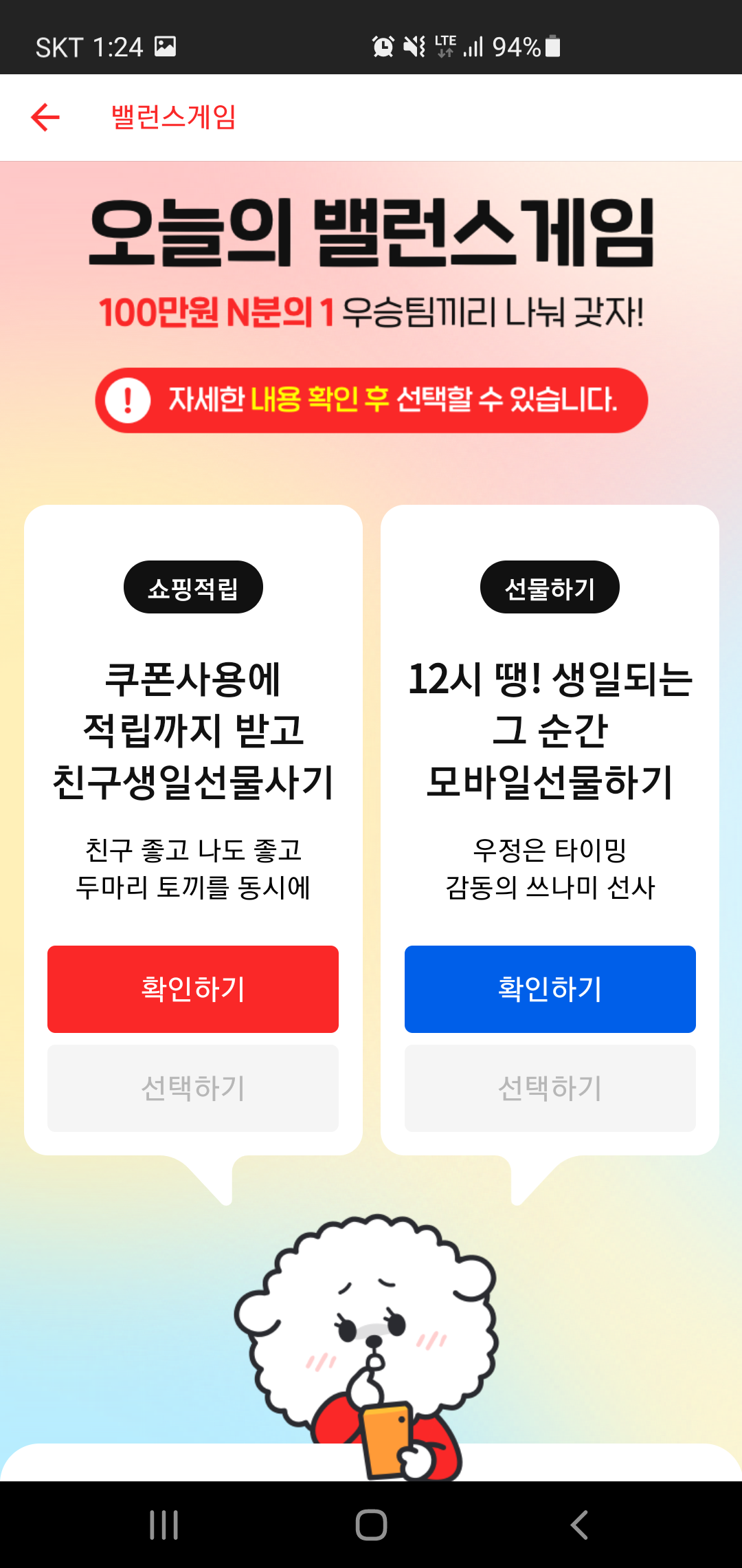 밸런스 게임에 등장하는 두가지 선택의 내용을 확인한 후 최종 하나를 선택하게 됩니다. 이때 고민이 되는 점이 바로 주어지는 혜택인데요, 우승팀에게만 혜택금액의 n/1을 해 지급하기 때문입니다. 즉.. 내가 원하는 답을 선택하기 보다 많은 사람들이 선택하는 답을 찾아야 주어지는 혜택을 받을 수 있으니 말이죠.