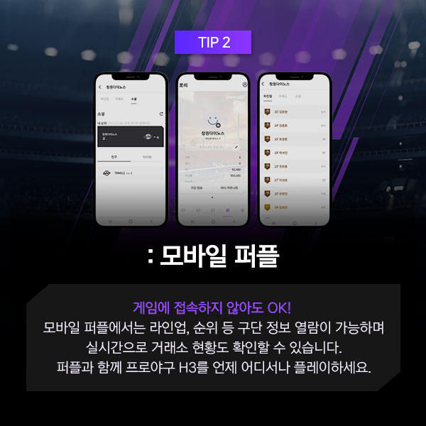 모바일 퍼플을 사용할 경우 알림이 지원되어 프로야구 H3에 접속하지 않아도 현재 상황을 실시간으로 파악할 수 있습니다. 또한 선수들의 라인업과 구단 명성, 게임정보부터 선수판매나 아이템 등록까지 이적시장 상황을 실시간으로 확인가능해 빠른 대처가 가능한데요, 향후 업데이트 예정이라고 하니 기대 해볼만 합니다.