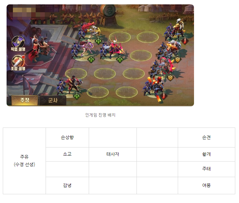 전투에 나서기에 앞서 전략과 전술을 어떻게 설정하고 상대를 공략할 것인지가 삼국지 혼의 핵심이라고 할 수 있습니다. 각 무장들은 각기 다른 특성을 가지고 있고, 그에 따라 배치와 조합도 달라지는데요, 무엇보자 조합을 어떻게 구성하느냐에 따라 추가적으로 받을수 있는 버프가 있어 이를 잘 챙기는 것이 중요합니다.