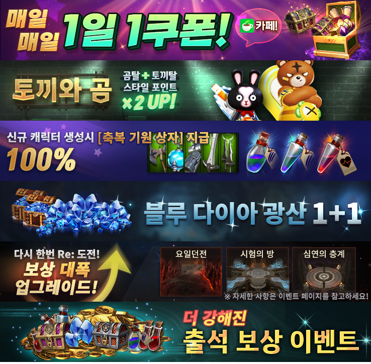 게임내에서 진행되는 이벤트인 도전 이벤트를 비롯해 공식카페에서 진행되는 이벤트등 풍성한 선물을 받을 수 있는 이벤트가 열리고 있습니다. 공식카페를 통해 쿠폰이 공개되는 매일매일 1일 1쿠폰 이벤트를 시작으로 Re : 도전~! 이벤트에 이르기까지 다양한 선물을 받을 수 있는 이벤트가 진행 중인 만큼 놓치지 마시고 꼭 챙겨보시기 바랍니다.