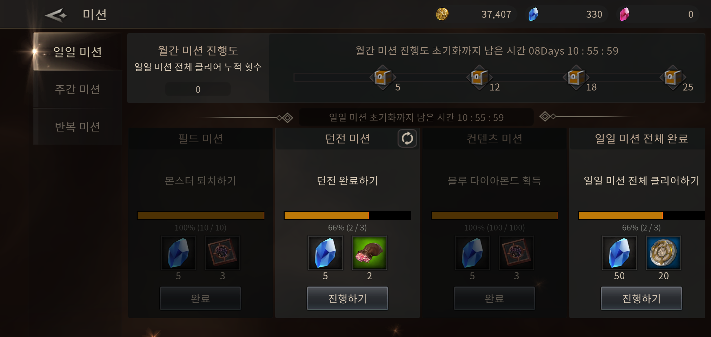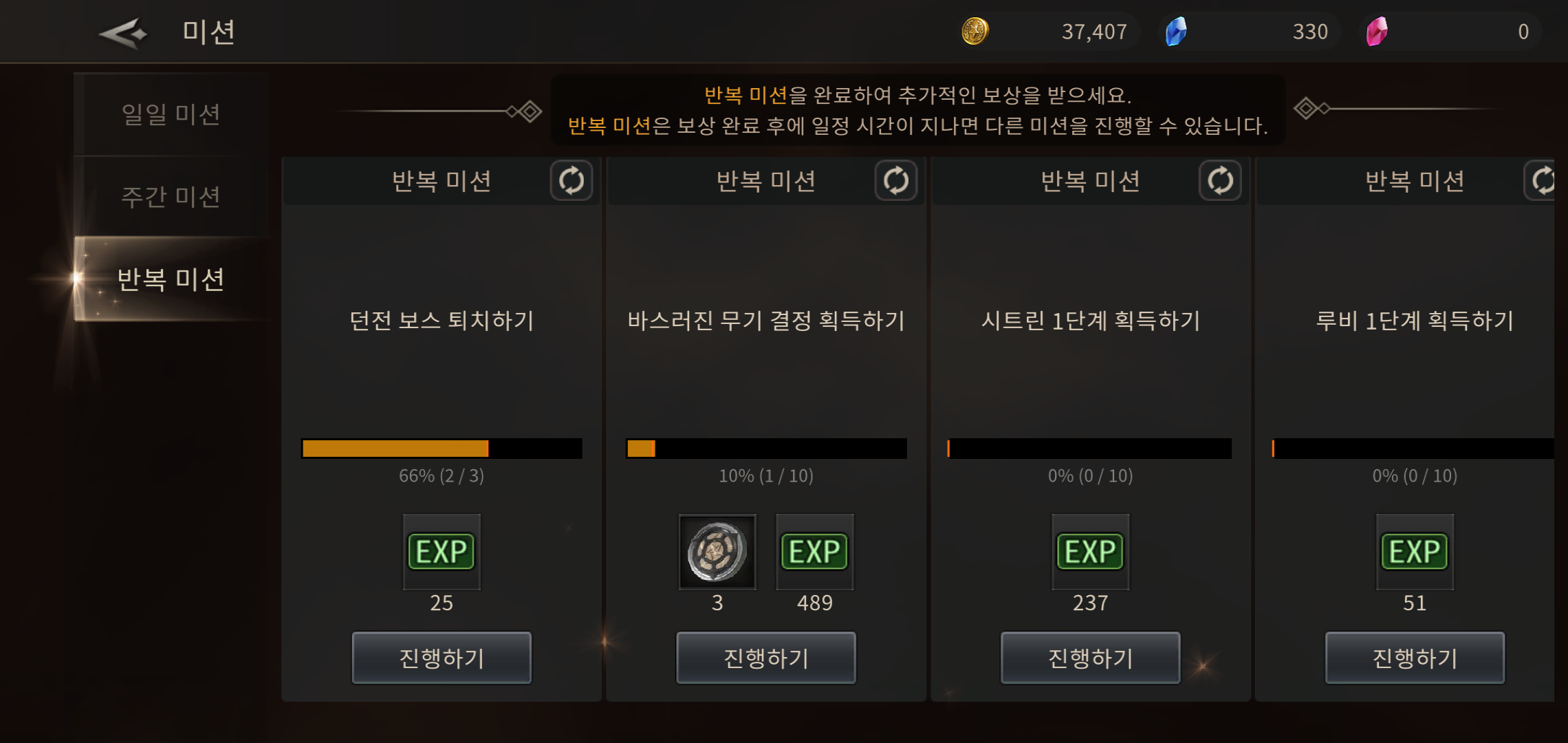 미션을 챙겨 경험치를 획득하는 것도 빠른 성장의 지름길입니다. 반복미션의 경우 클리어한 이후 일정 시간이 지나면 다른 미션을 받을 수 있는데요, 경험치가 낮은 미션보다는 가능한 많은 경험치를 주는 미션을 선택해 클리어 하는 것을 추천드립니다.