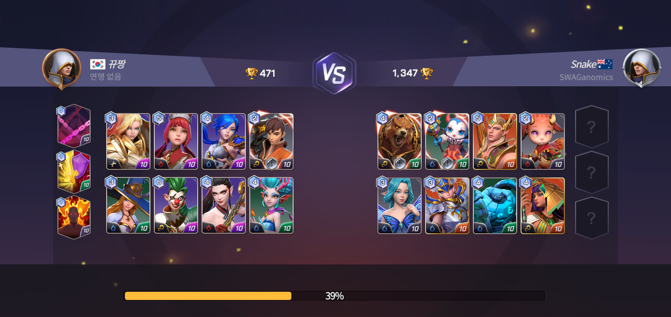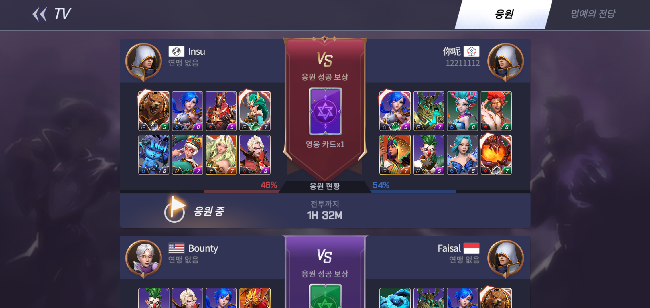 서머너즈 워: 백년전쟁의 재미는 국내에 한정되지 않고 글로벌로 즐기는 실시간PVP대전이라는 점입니다. 새벽에 접속해 대전을 신청해도 순식간에 매칭이 될 정도로 플레이를 즐기는 유저들이 많아 기다림에 지칠 이유가 전혀 없을 정도 입니다. 또한 매칭되는 상대의 편성은 확인 가능하지만 스킬은 히든으로 남겨두어 어떤 전략으로 상대를 하게 될지 고민하게 되는 재미도 있구요.