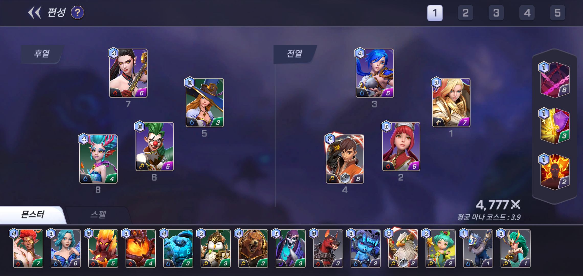본격적인 실시간PVP를 즐기기 위해선 보유한 캐릭터와 스펠을 활용해 전열과 후열에 위치하는 8명의 캐릭터를 편성해야 합니다. 각 캐릭터는 불, 물, 바람, 빛, 어둠 5가지 속성 중 하나의 속성을 가지고 있으며, 탱,딜,힐에 맞는 특징을 가지고 있어 이를 잘 활용하는 것이 중요합니다.