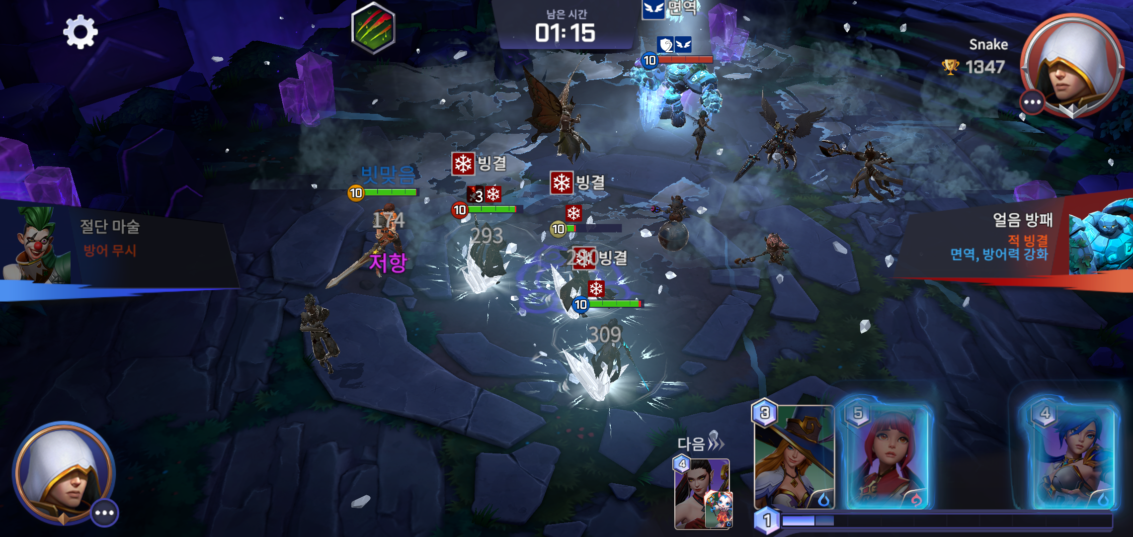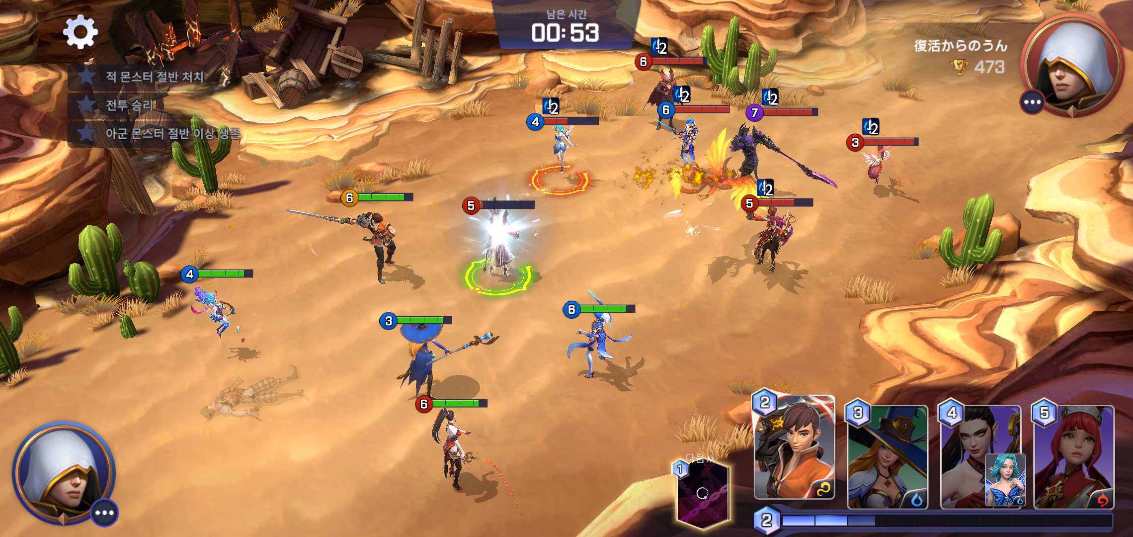 전투는 난타전이라는 이야기가 무색하지 않을 정도로 양 진영의 치열한 공방이 진행됩니다. 여기서 중요한 점은 상황에 맞는 캐릭터 스킬을 사용해야 한다는 점인데요, 스킬을 주고 받는 턴제가 아니기 때문에 동시에 스킬을 주고 받기도 하고, 스킬 선택 타이밍에 따라 카운터를 날리는 순간도 상대보다 빠르게 잡을 수 있기도 합니다.