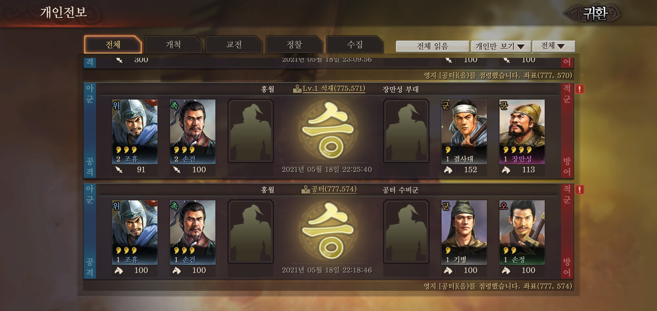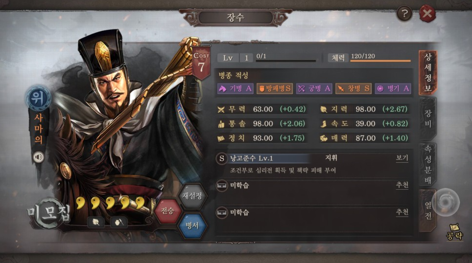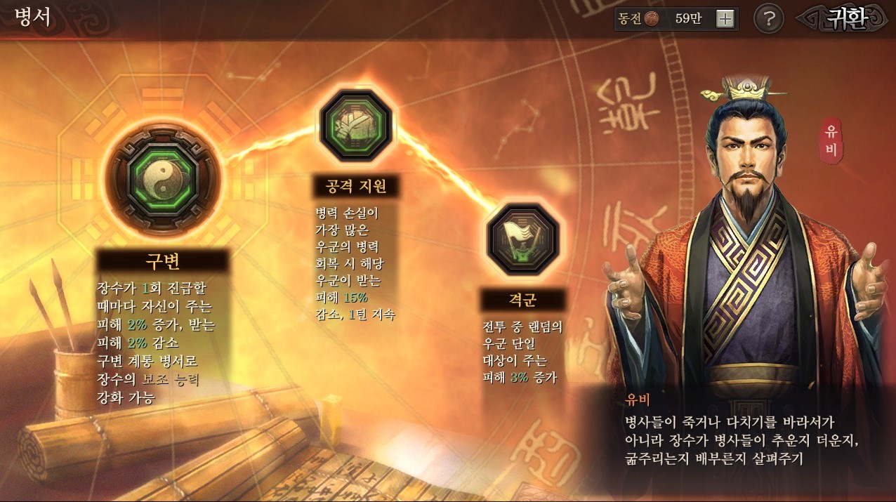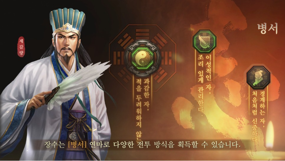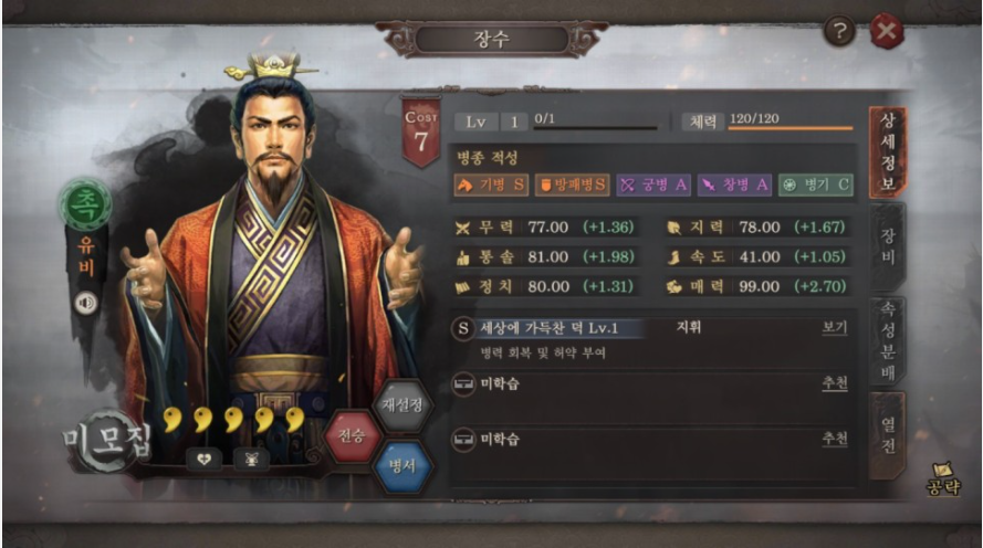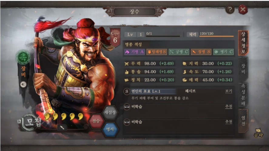 삼국지 전략판을 플레이 하는데 있어 잊지 말아야 할 점은 좋아하는 장수나, 주력하는 장수를 활용한 병법구성에 있어 조금만 신경써도 결과가 달라진다는 점입니다. 예를들어 5성 장수인 장비의 경우 딜이 좋아 개척하는데 무척 유리한데요, 힐을 할 수 있는 유비와 짝을 이룬다면 보다 빠른 개척이 가능합니다.