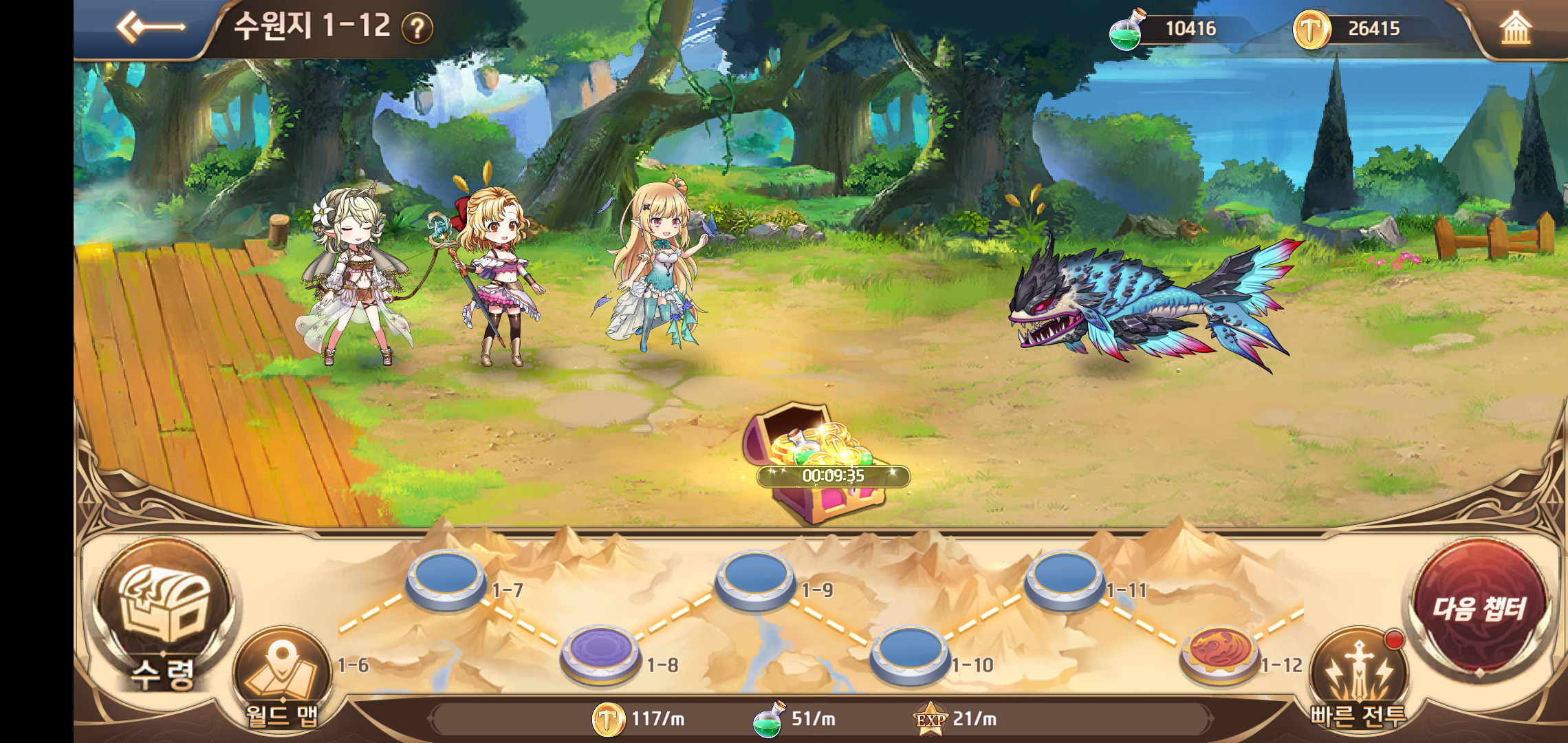 소녀X헌터는 전투를 진행하지 않아도 클리어한 스테이지에 따라 방치형 전투가 진행됩니다. 그에 따른 경험치와 함께 추가 보상도 주어져 알아서 성장하고, 접속해 플레이를 해야 한다는 부담감도 크지 않아 보아 여유로운 플레이를 즐길 수 있습니다.