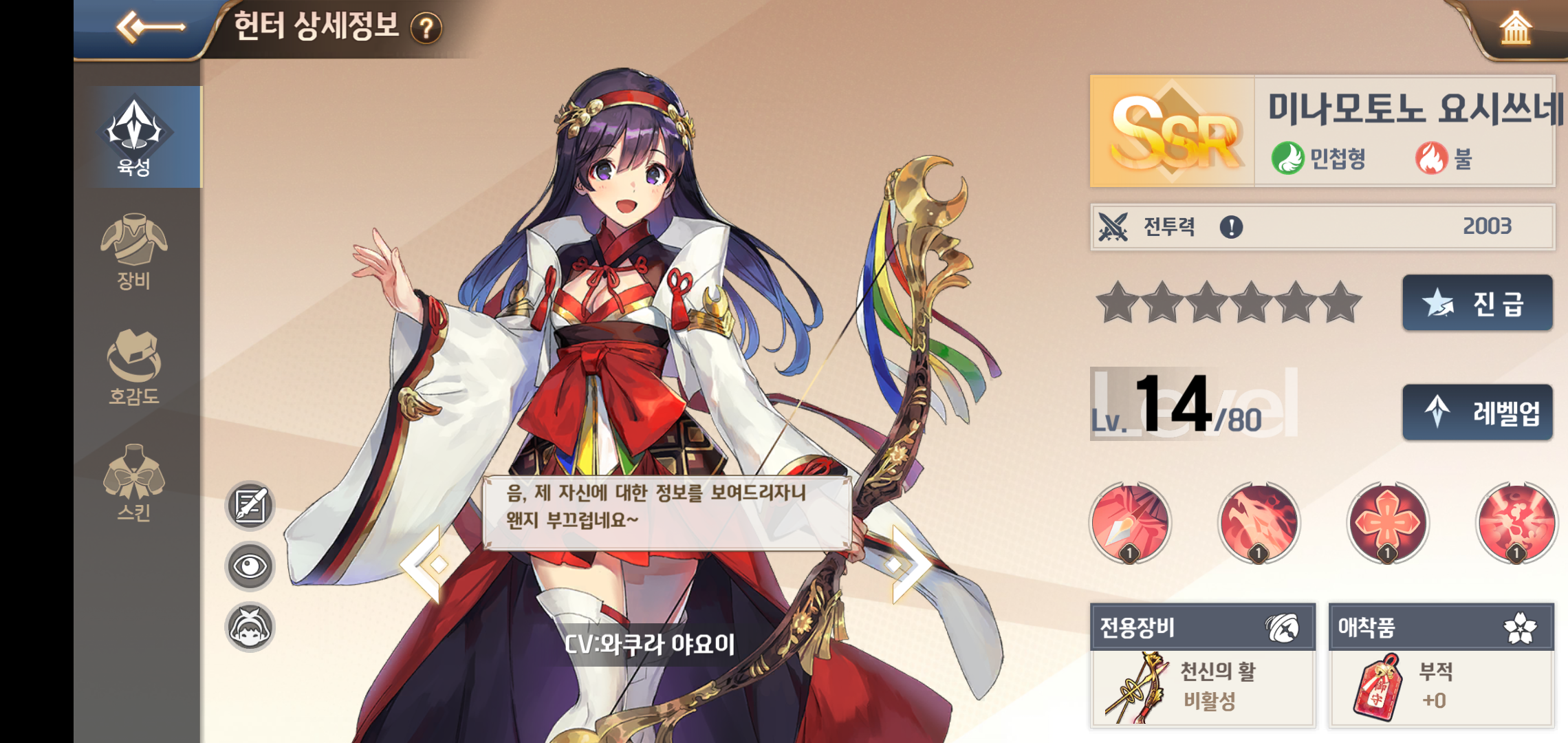 애정이 곧 SS등급으로 표현되는 SSR등급 캐릭터 미나모토노 요시쓰네. 이후에도 SSR등급 캐릭터를 획득했지만, 등급표 맨위에 위치하는 영웅은 획득하지 못해 아쉬웠습니다. 다만 위안을 삼는다면 보유한 캐릭터의 진급은 생각보다 쉽게 가능할 것 같다는 점이지만 말이죠.
