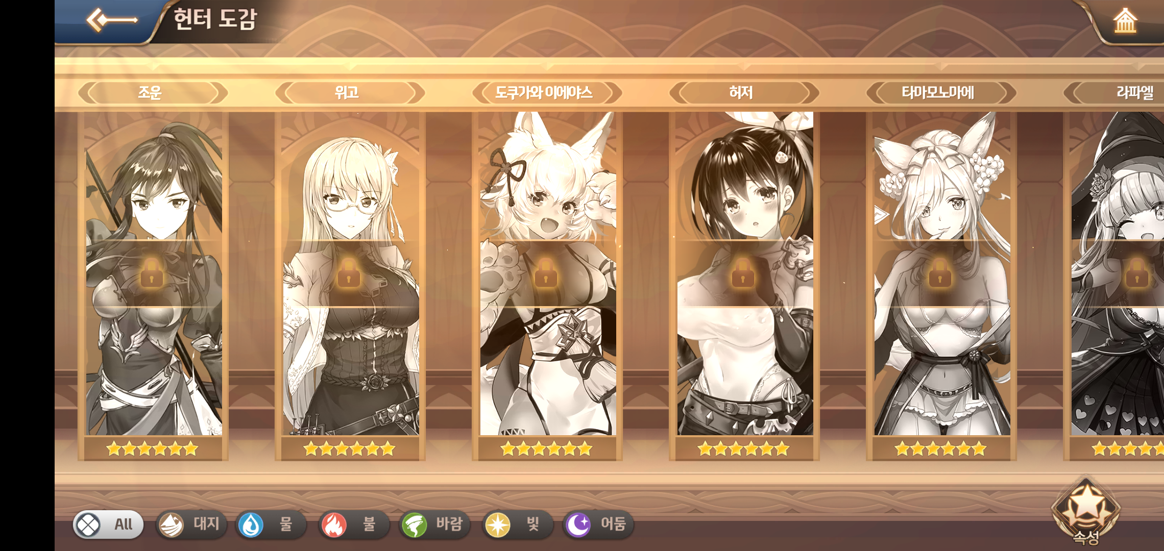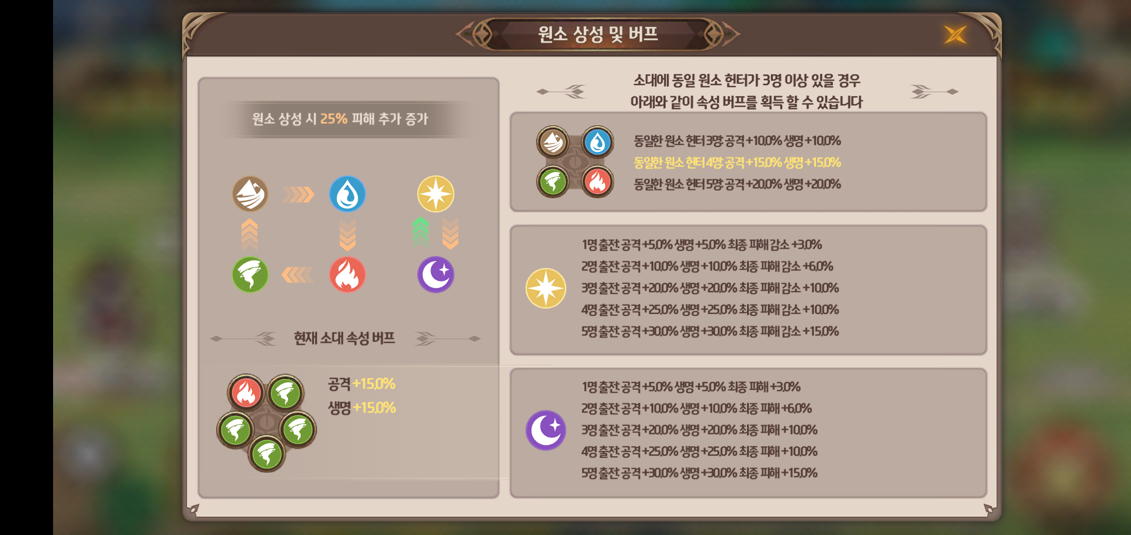 소녀X헌터 리세마라 이야기가 나오는 가장 큰 이유 중 하나. 바로 초반 획득가능한 캐릭터에 따라 이후 스테이지가 달라지기 때문입니다. 대지, 물, 불, 바람, 빛 그리고 어둠 속성으로 구성된 캐릭터들은 속성별 상성을 가지고 있는데요, 원소 상성과 버프를 보면 빛과 어둠 속성이 독보적인 점을 알 수 있습니다.