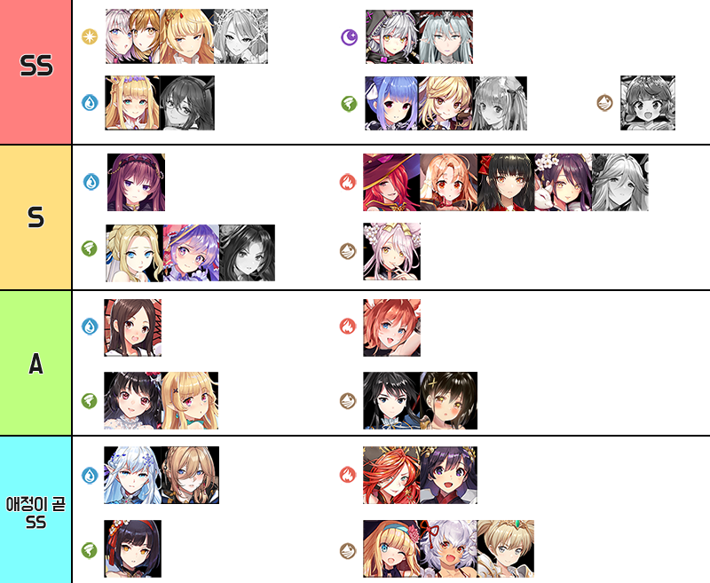 리세마라를 해야 할지 고민되거나, 캐릭터 성장에 대한 고민은 현재 공개된 등급표를 참고하면 좋습니다. 빛과 어둠 속성인 캐릭터는 전부 SS등급으로 포진되어 있어 두 속성이 얼마나 우위에 있는지 보여주고 있기도 합니다. SS등급의 경우 물과 바람 속성 캐릭터가 들어가 있는데요, 물 속성의 헬레나는 유일하게 부활을 소유하고 있는 캐릭터이기도 해서, 빛과 어둠 속성 캐릭터 획득과 함께 우선하면 좋습니다.