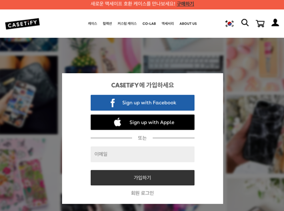 케이스티파이 케이스 구매에 있어 간혹 어려워 하는 분들이 계셔서 프로모션 코드를 활용한 구입 방법을 간단히 알려드립니다. 먼저 케이스티파이에 가입해야 하는데요, 페이스북 계정이나 애플 계정으로도 가입 가능하니 편리한 방법으로 선택하면 됩니다.