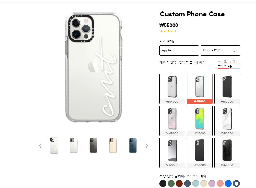 회원가입이후 상단 커스텀케이스를 선택 후 아이폰 케이스를 선택하면 기종에 따른 케이스 선택이 가능한데요, 여기서 아이폰 기종을 선택한 다음 케이스 범퍼를 선택하고, 문구를 원하는 스타일과 폰트 색상등을 기재해준 다음 카트에 담아주면 됩니다.