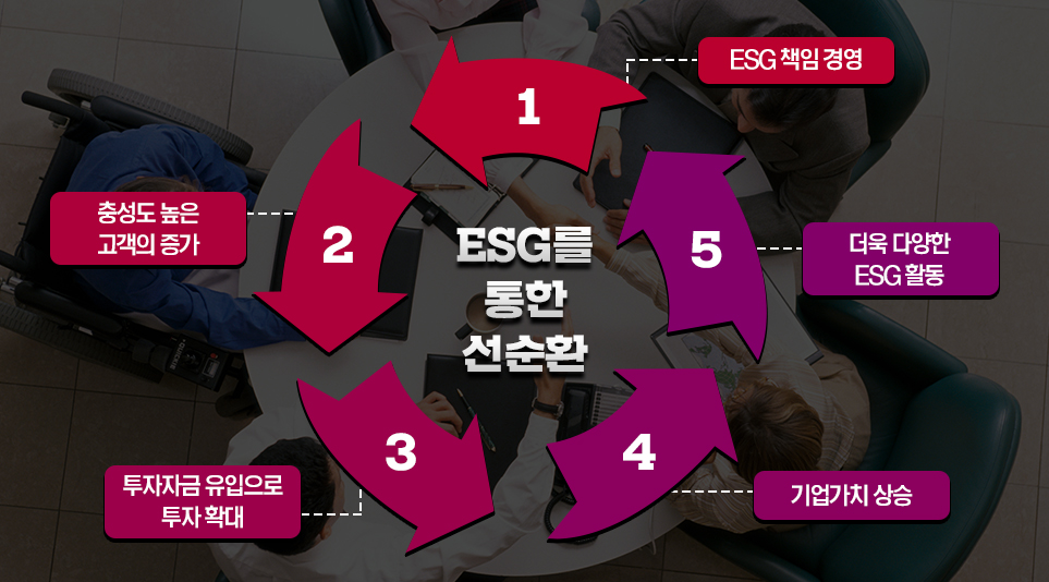 기업 입장에서도 ESG를 통한 선순환에 있어 환영하는 입장입니다. 기업으 이익과 사회적 가치를 동시에 수행할 수 있다는 인식이 자리잡아 가고 있기 때문인데요, ESG 책임경영은 충성도 높은 고객의 증가로 이어지고 투자자금 유입으로 투자확대로 이어져 기업가치의 상승으로 이어지고 다시 이를 바탕으로한 다양한 ESG활동의 선순환 구조가 이어지기 때문입니다.
