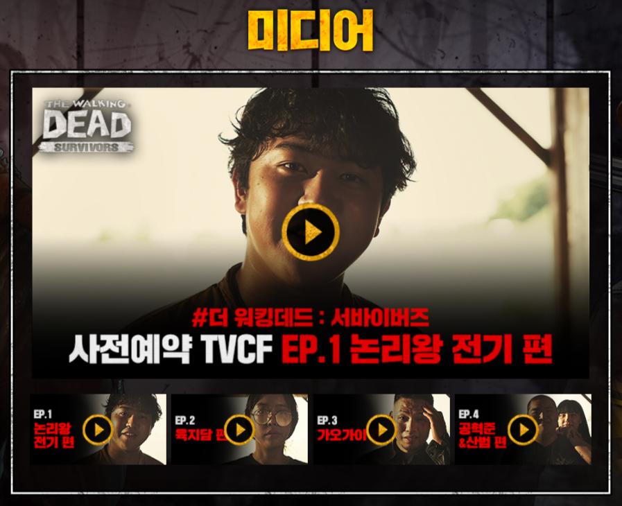 더 워킹데드: 서바이버즈는 국내 출시를 앞두고 선택한 홍보모델은 이경영을 필두로한 웹예능 머니게임의 출연진입니다. 배우 이경영이 가지고 있는 매력도 좋지만, 머니게임 출연진들과 만나면서 보여주는 시너지는 기대 이상이었는데요, 최근 공개된 공개CF 영상을 보면 정말 모델 선택을 잘했다는 생각이 절로 들 정도입니다.