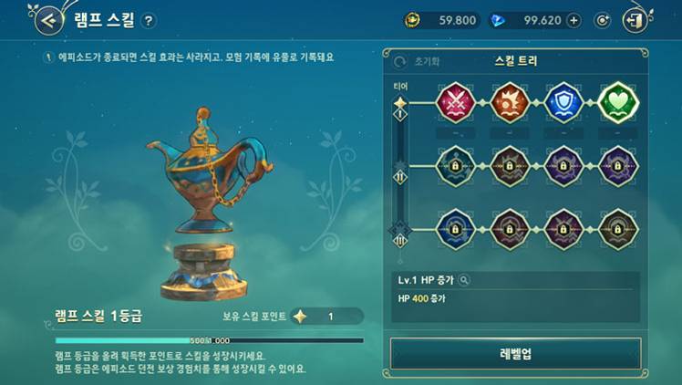에피소드 경험치의 경우 고대 마인의 램프를 성장시키고, 에피소드 스킬을 획득하게 할 수 있기 때문에 무척이나 중요합니다. 램프 스킬은 전투력을 향상시켜 에피소드를 공략하는데 도움을 받을 수 있는 만큼 이벤트 기간 램프 스킬을 챙겨주는 것이 중요합니다.