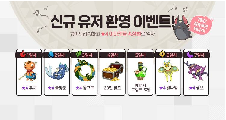 제2의나라를 새롭게 시작한 유저를 위한 신규 유저 환영 이벤트는 7일간 접속하면 4성 이마젠을 속성별로 획득할 수 있는 특별한 이벤트입니다. 1일차 불속성 루치를 시작으로 7일차 쌈보에 이르기까지 출석만 해도 다 받을 수 있습니다. 속성별로 4성 이마젠을 획득할 수 있는 기회 언제 또 올지 모릅니다!!