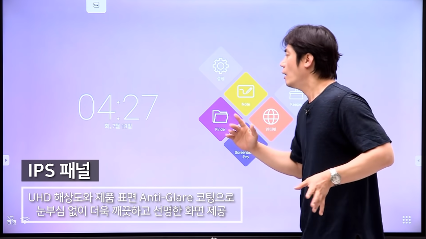 황현필 강사분이 LG칠판으로 강의하면서 무척이나 만족스러워한 장점 중 빛반사에 대한 언급이 가장 많았습니다. IPS패널과 Anti-Glare 코팅으로 선명한 화면을 제공하는 것은 기본, 어느 각도에서 보더라도 달라지지 않는 화면이었는데요, 눈부심도 없어 강의에 집중 할 수 있었던게 아닐까 합니다.