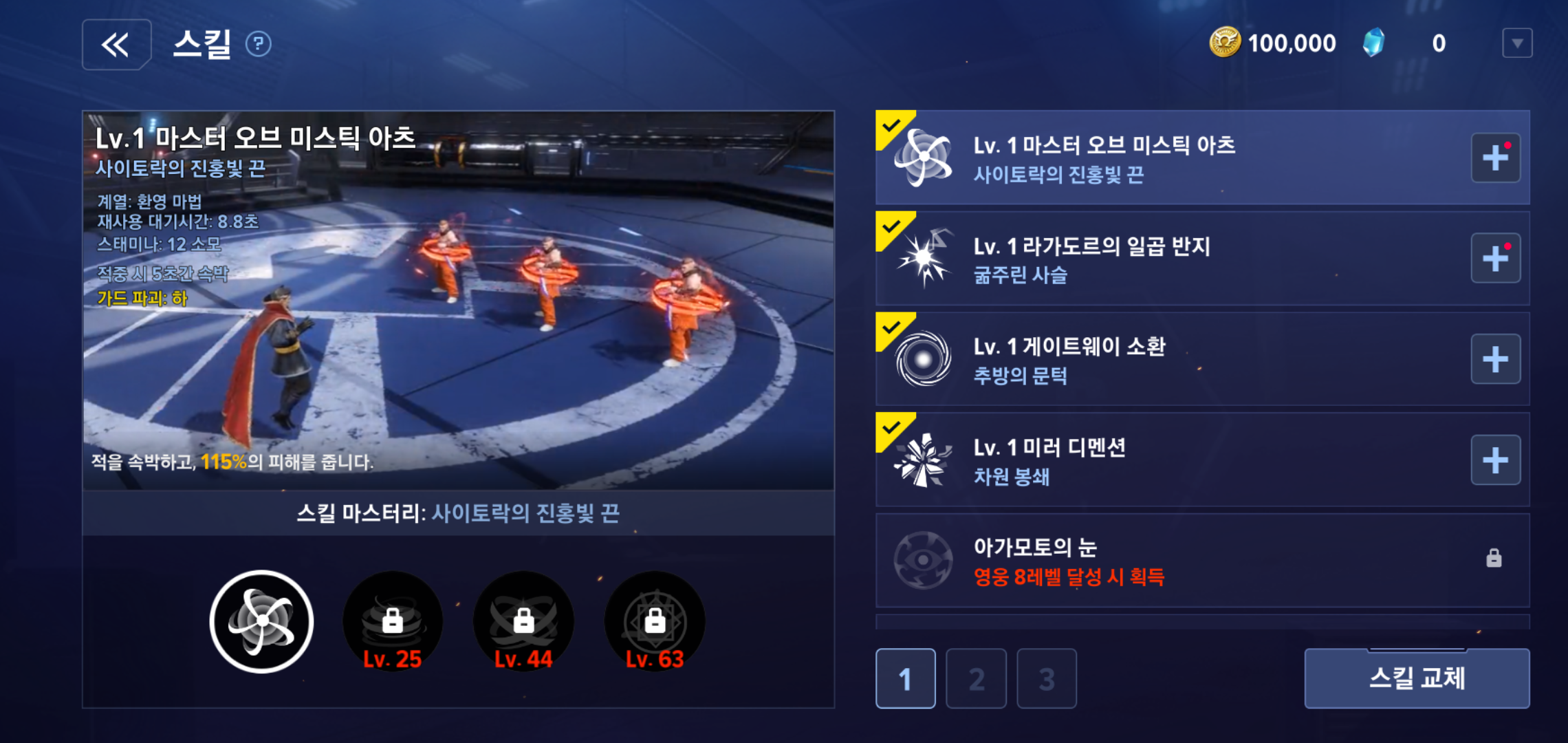 영웅이 성장하면서 함께 업그레이드 해야 하는 스킬은 최대 4개까지 늘어나기 때문에 어떤 스킬마스터리를 사용하고, 활용할 것인지가 중요합니다. 닥터 스트레인지의 경우 마스터 오브 미스틱 아츠는 첫번째 스킬인 사이토락의 진홍빛 끝을 유지하는게 좋은데요, 스킬이 업그레이드 된다고 해서 무조건 앞서 스킬보다 좋다고 할 수 없기 때문에 스킬을 구성에 따라 적절한 조합을 만들어 주는게 유리합니다.