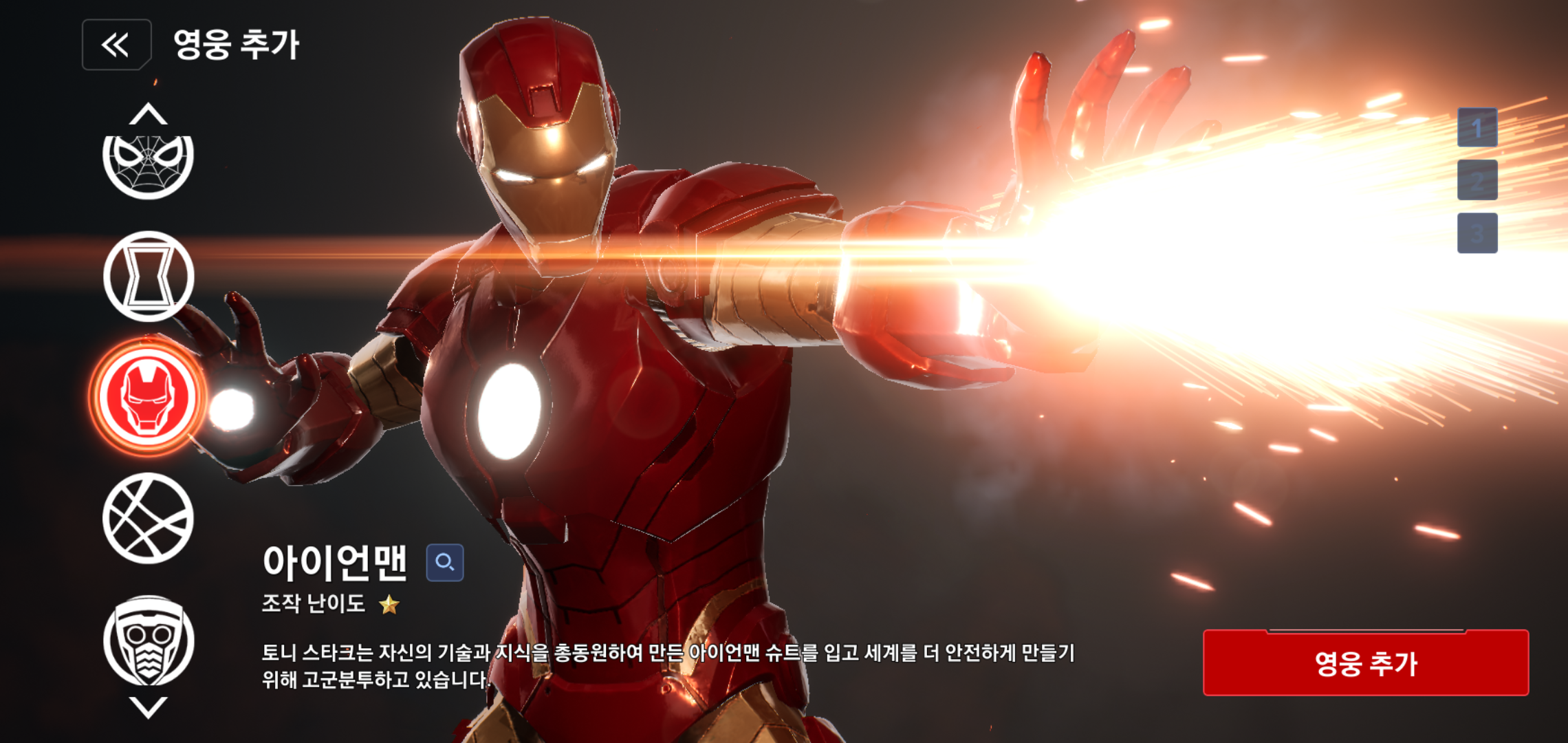등장하는 영웅들의 튜토리얼이 마무리 되면 본격적인 마블 퓨처 레볼루션을 즐길 영웅을 선택하게 됩니다. 캡틴 아메리카를 시작으로 캡틴마블, 스파이더맨, 아이언맨, 블랙위도우, 닥터 스트레인지, 스톰, 스타로드로 구성되어 있고 단 한명의 마블 영웅을 선택하게 됩니다.