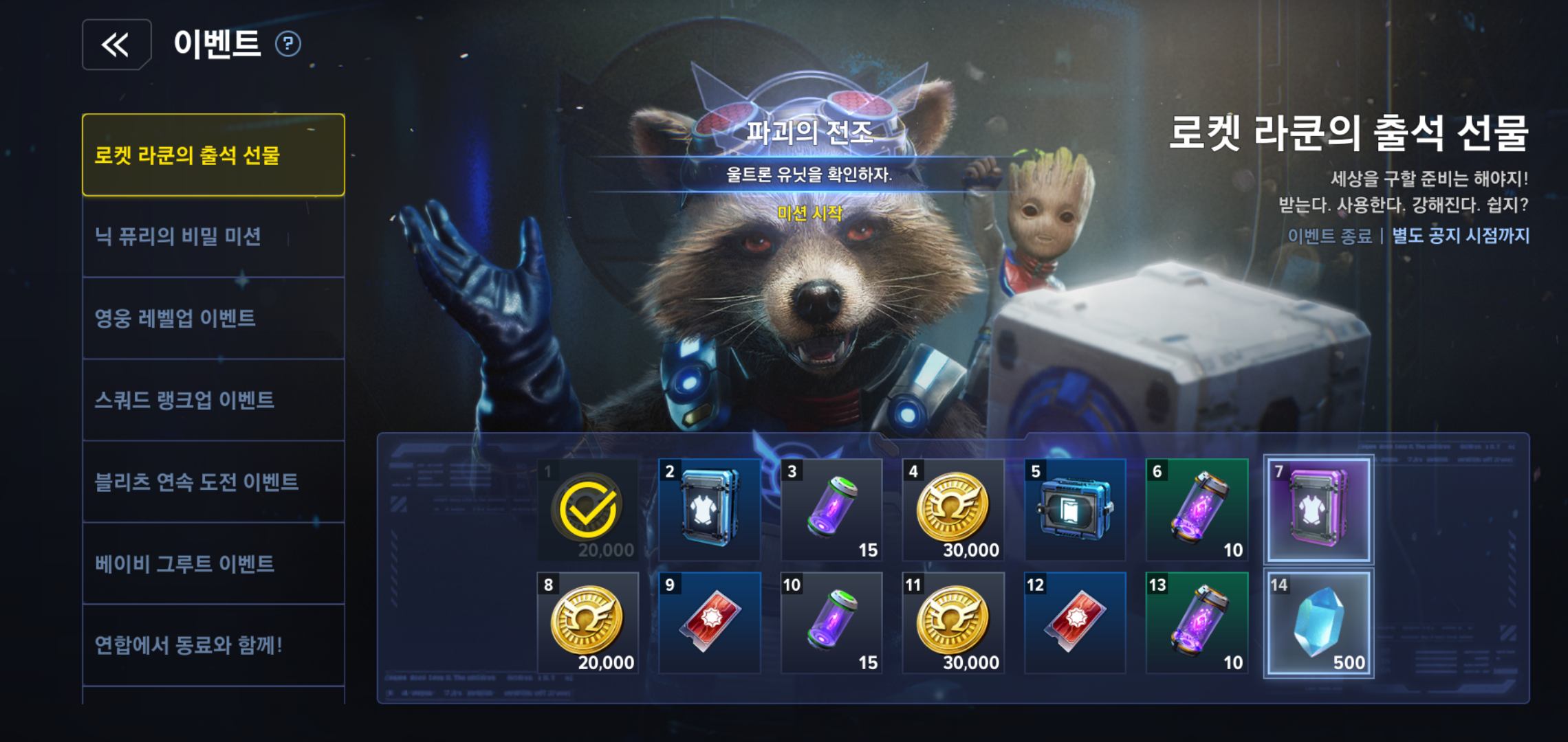 다양한 이벤트도 진행되고 있어 누구나 참여 가능합니다. 로켓 라쿤의 출석 선물을 시작으로, 닉 퓨리의 비밀 미션, 영웅 레벨업 이벤트 등 풍성한 아이템을 보상으로 받을 수 있는 이벤트가 진행 중인데요, 즐기기만 해도 받을 수 있는 선물이 가득한 만큼 서둘러 접속 마블 영웅들과 함께 오픈월드 액션RPG의 재미를 즐겨보시기 바랍니다!