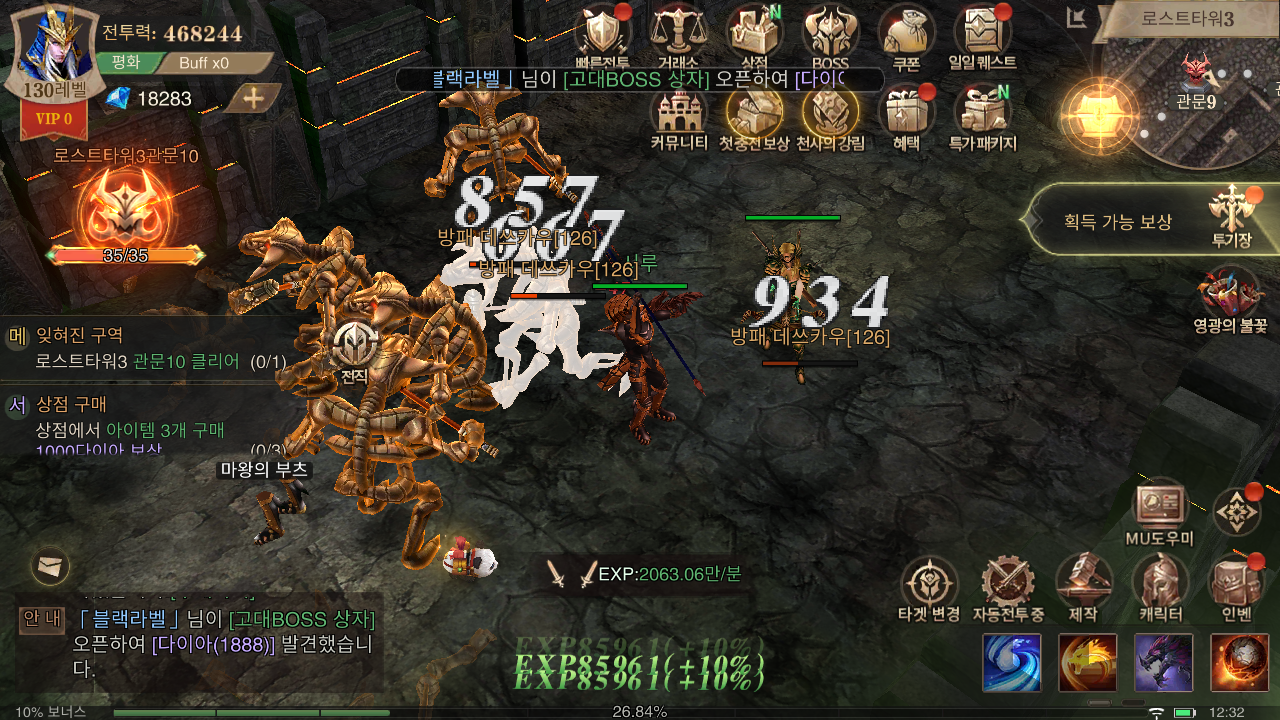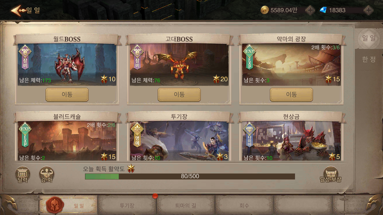 중간중간 레벨 제한이나 전투력 때문에 진행이 막히는 경우가 발생하기도 합니다. 이럴 땐 월드 보스나 악마의 광장 등을 활용해 부족한 전투력을 메꿔줄 수 있는 장비를 획득하고, 경험치를 획득해 필요한 조건을 만족시킬 수 있습니다.