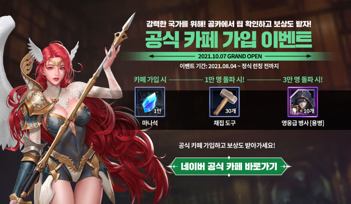 공식 카페 가입 이벤트도 진행 중입니다. 정식론칭전까지 공식 카페에 가입한 인원에 따라 추가 보상이 주어지는데요, 마나석을 시작으로 채집 도구, 영웅급 병사 선물까지 주어져 사전등록 참여와 함께 공식 카페 가입도 잊지 마시기 바랍니다.