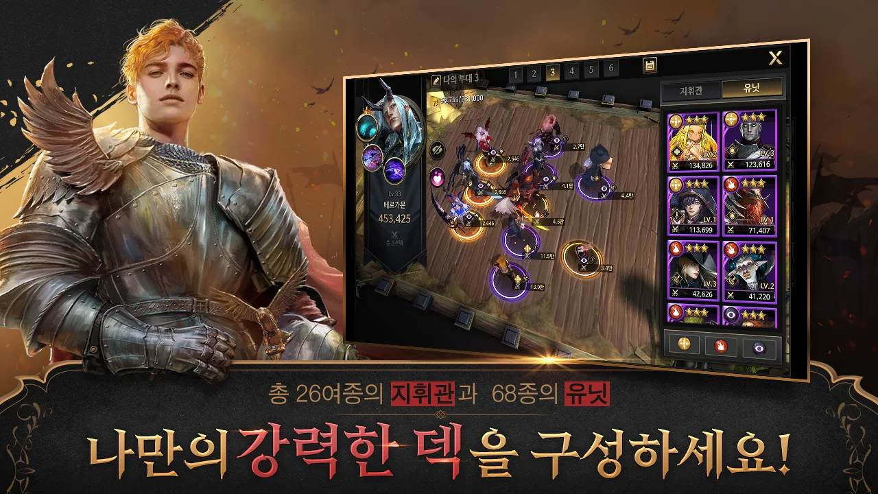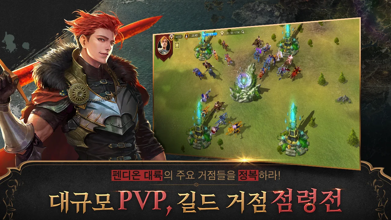 광활한 대육, 펜디온을 무대로 펼쳐지는 길드 간의 치열한 전쟁은 실시간 전투 시스템을 통해 진행되어 긴장감을 높여주었고, 26종의 지휘관과 68종의 병사들로 구성되어 있어 나만의 강력한 덱을 구성한 전략을 세우고, 전쟁을 승리로 이끌어 내는 재미도 기대되는 부분입니다.