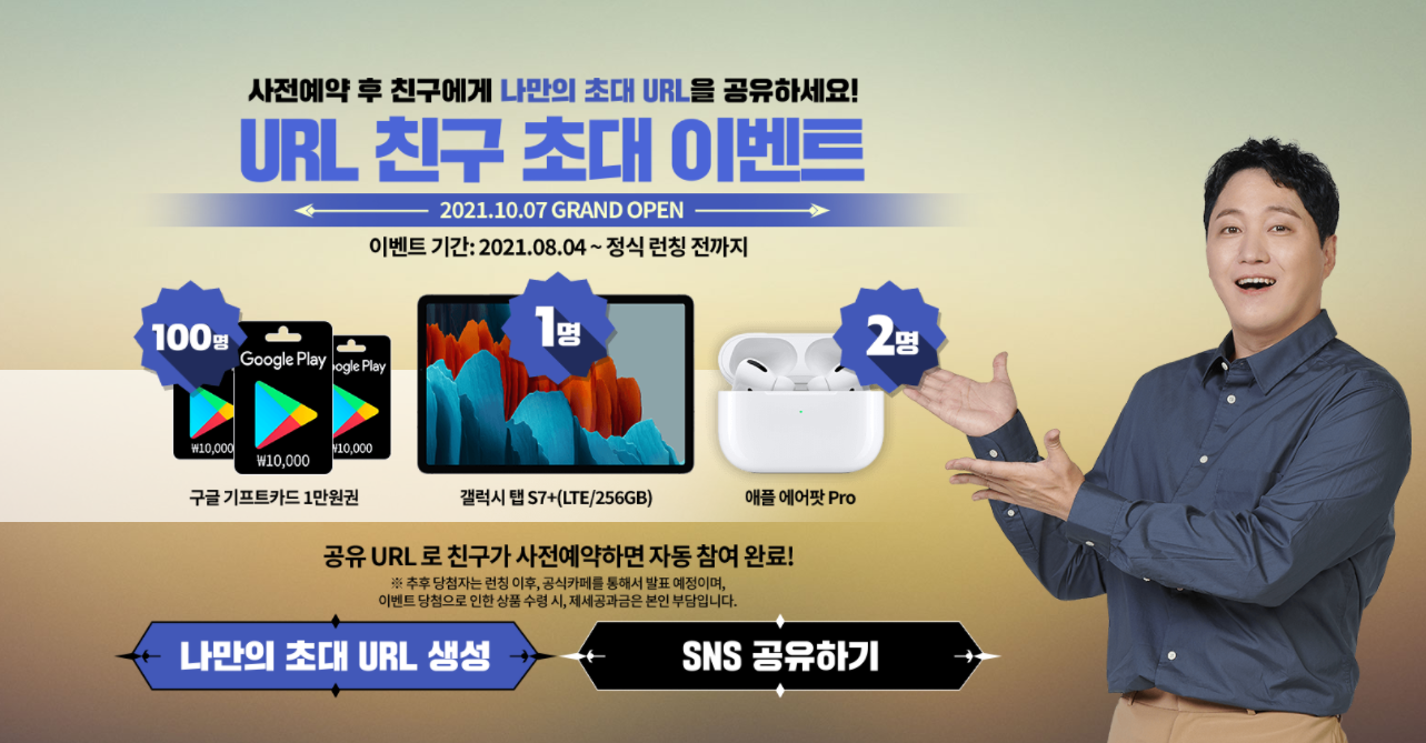 사전예약에 참여한후 나만의 초대 URL을 공유해 친구를 초대하면 추첨을 통해 구글 기프트카드 1만 원권과 애플 에어팟 Pro, 갤럭시 탭 S7+ 를 선물로 받을 수 있습니다. 세계수 점령 이벤트와 맞물려 사전 길드원 모집을 하는 분들이라면 친구 초대 이벤트를 적극 활용하시는 것도 좋을 것 같습니다.