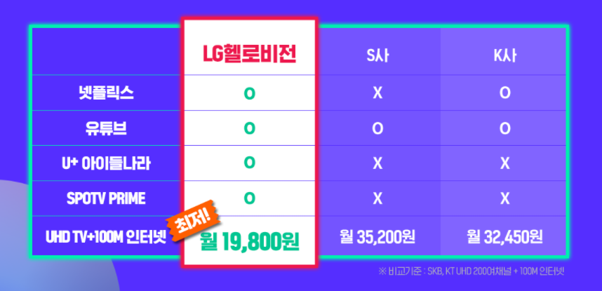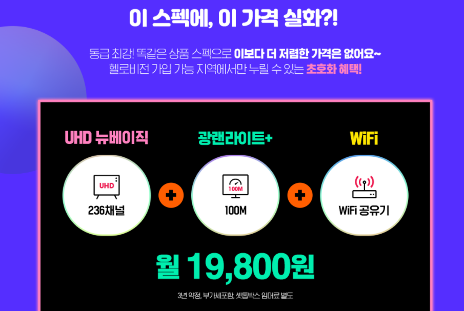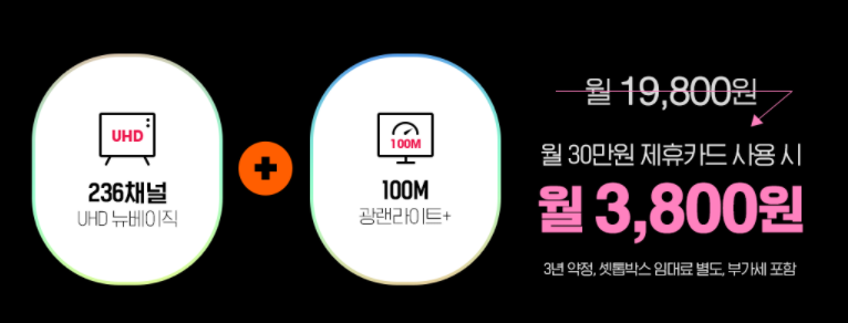 똑같은 상품 스펙이지만 가격대를 확 낮춘 상품도 준비되어 있는데요, UHD 뉴베이직 236채널과 100M 광랜라이트 그리고 와이파이 사용까지 가능한 상품을 월 19,800원으로 만나볼 수 있습니다. 다른 통신사와 비교를 해보면 정말 저렴하다는 게 느껴질 정도인데요, 넷플릭스를 비롯한 콘텐츠를 활용까지 다 하면서 비용은 낮춰 부담을 확 줄였습니다.