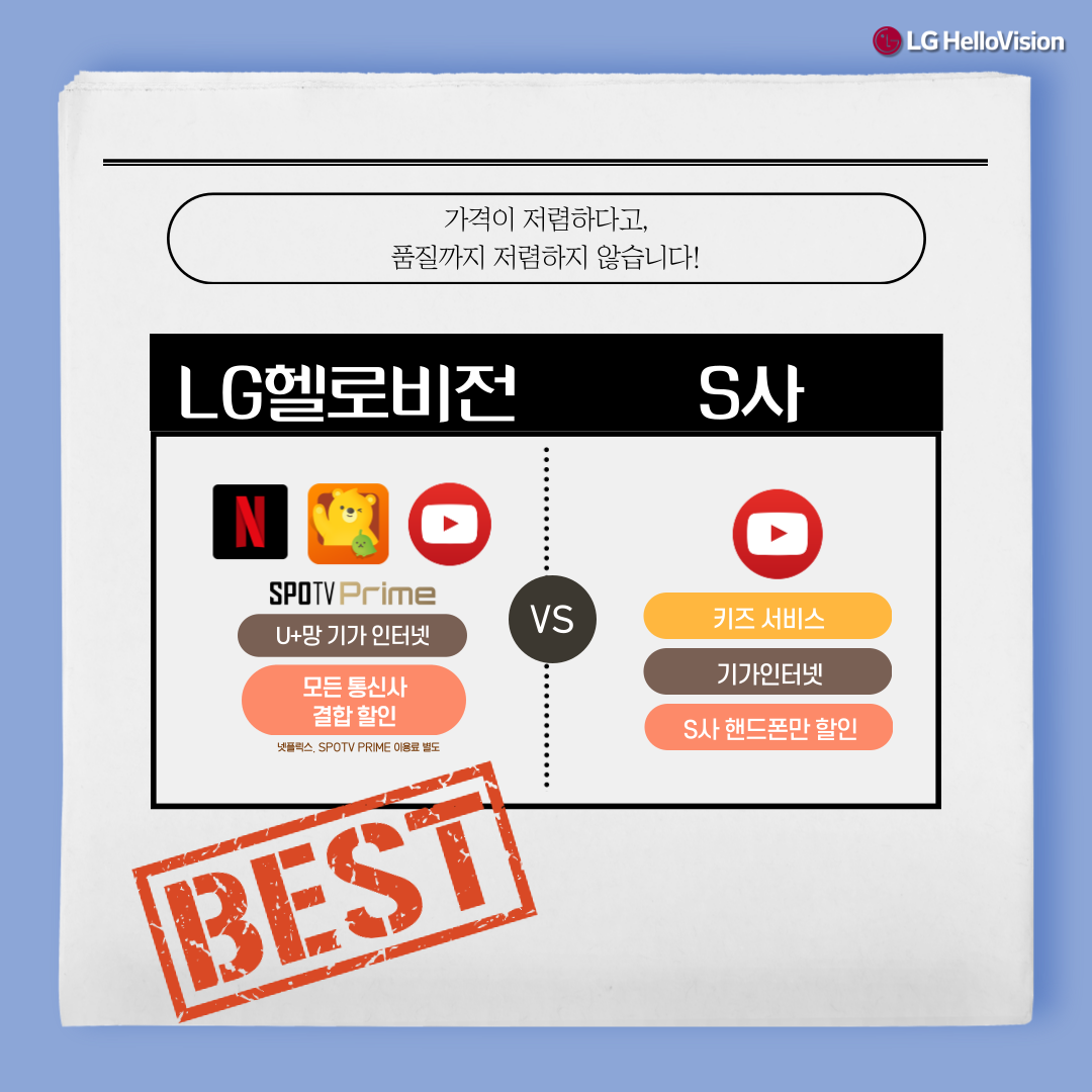 같은 상품, 더 합리적인 가격. 방송, 인터넷 상품 비교해 보고 내맘대로 골라 할인 받자! LG헬로비전
