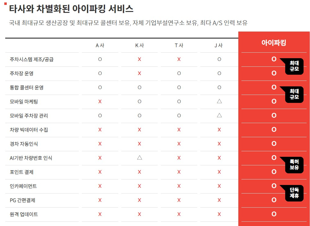 타사와 아이파킹의 차별점은 비용 적인 측면 외에도 많은데요, 무엇보다 국내 최대 규모 생산공장과 최대 규모의 연구 및 콜센터를 보유한 점은 그냥 지나칠 수 없는 부분입니다. 특히 AI기반 차량번호 인식은 특허를 보유하고 있을 정도 있을 정도로 설치부터 관리에 이르기까지 기술력은 인정할 수밖에 없는 부분입니다.