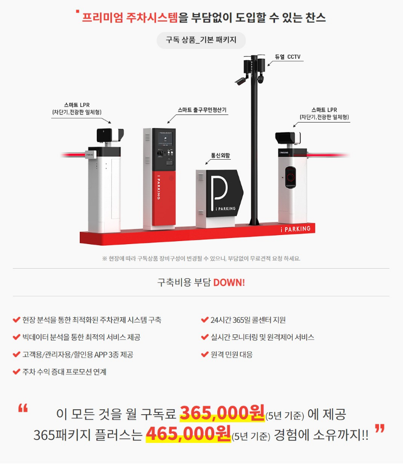 아이파킹 365 패키지의 경우 5년 약정 기준 월365,000원의 비용으로 스마트 무인 주차 시스템을 초기 구축비용 부담 없이 설치 가능하고, 주차관리부터 A/S, 운영, 민원처리까지 원스탑으로 해결할 수 있는 장점을 가지고 있습니다.