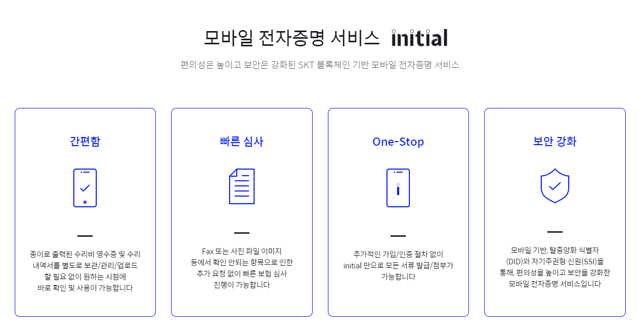 보험 접수 진행시 일반접수가 아닌 모바일 전자증명 서비스인 이니셜을 통한 접수도 가능한데요, 일반 접수와 달리 간편하고 빠른 심사가 가능한 점이 특징입니다.