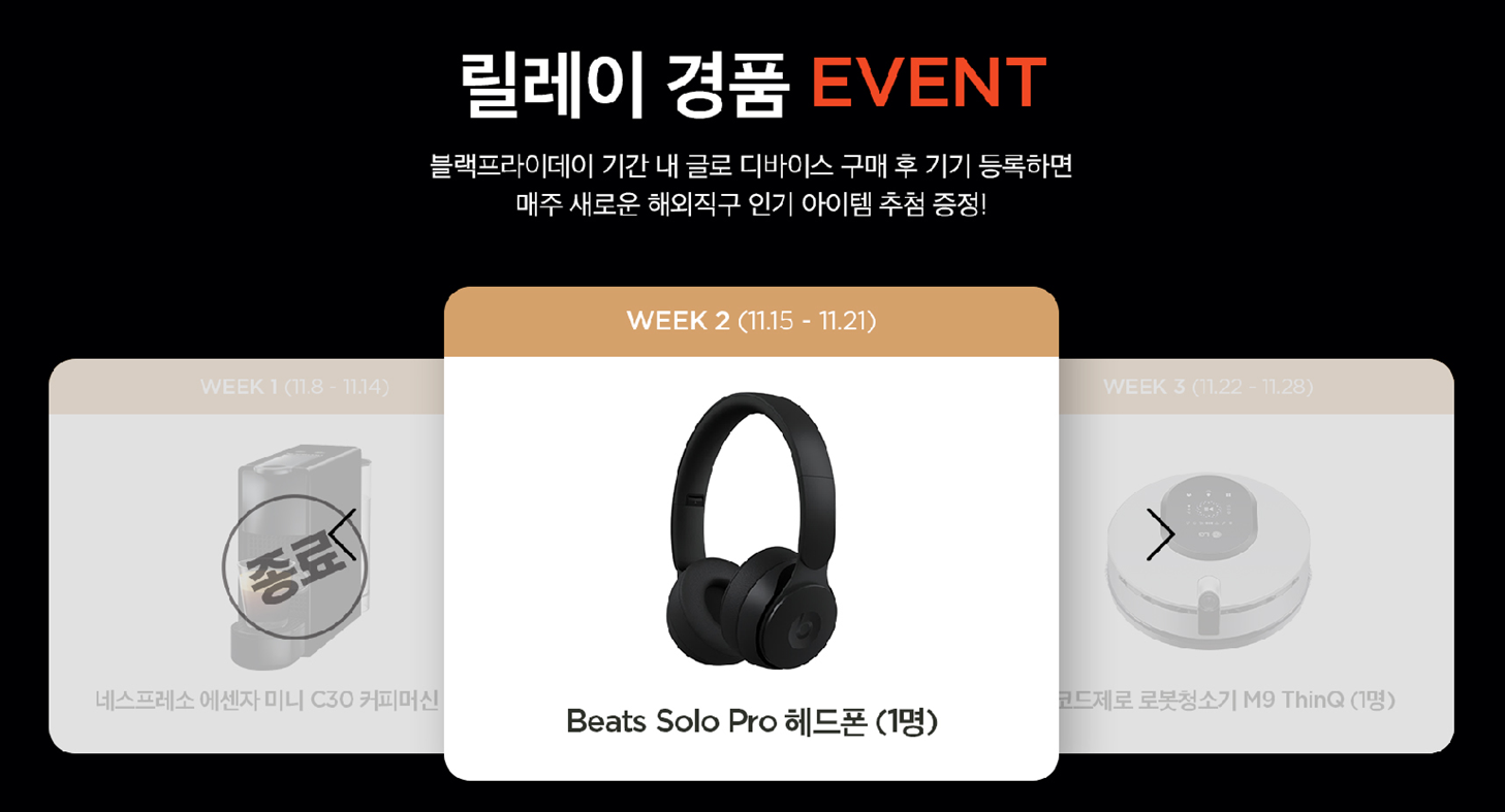 블랙프라이데이 기간 내 글로프로 90% 할인 이벤트와 함께 릴레이 경품 이벤트도 놓치지 않고 챙겨야 합니다. 기간 내 글로 디바이스 구매 후 기기를 등록하면 매주 새로운 해외직구 인기 아이템을 추첨을 통해 증정하는데요, 1주차 네스프레소 에센자 미니 C30 커피머신을 시작으로 Beats Solo Pro 헤드셋, LG코드제로 로봇청소기, 삼성 QLED 4K 65인치 TV 선물이 준비되어 있으니 글로프로와 글로프로 슬림 중 원하는 제품을 선택하고 릴레이 경품 이벤트에 참여해 행운이 주인공이 되어 보시기 바랍니다.