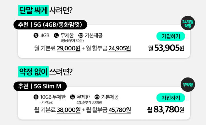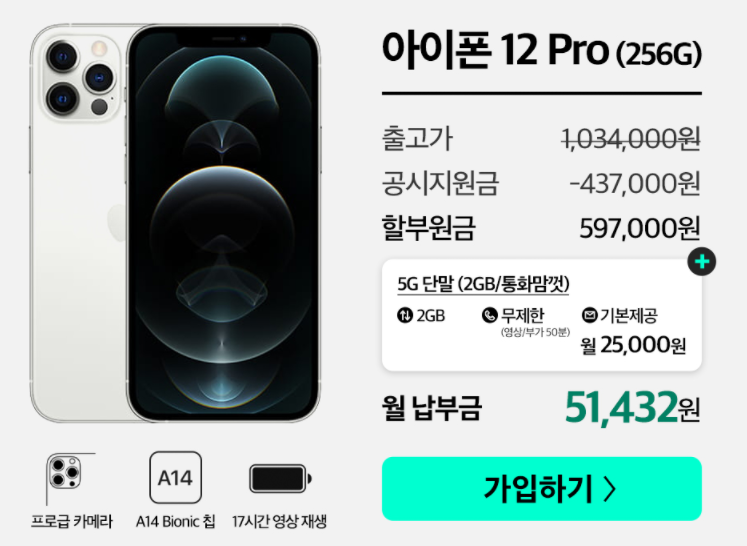 중고폰으로 아이폰 12 프로의 경우 단말기를 싸게 구입하는 조건과 약정없이 사용할 수 있는 조건 중 하나를 선택할 수 있습니다. 단말기를 싸게 구입할 경우에는 월 기본료와 할부금을 더해 5만 원대 비용으로 사용 가능하며, 무약정 사용을 원한다면 8만 원대 비용으로 선택 가능합니다.