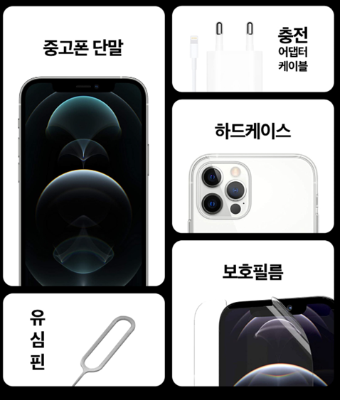 아이폰 12 프로를 선택할 경우 여러 사은품도 받을 수 있는데요, 중고폰 단말을 포함해 하드케이스, 유심핀 그리고 보호필름이 주어집니다. 그리고 또 한가지! 신형 휴대폰의 경우 충전 어댑터를 포함하지 않는 반면 kt M모바일 중고폰은 충전 어탭터와 케이블을 함께 받을 수 있습니다.