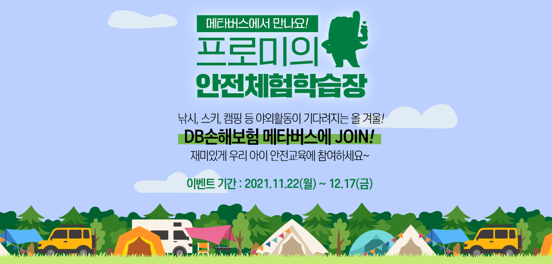 코로나 여파로 인해 오프라인에서 진행되었던 많은 행사들이 축소되거나 취소되는 상황이 지속되고 있습니다. 아이들의 안전교육도 영향을 받고 있는데요, 올 겨울보다 안전하고 흥미진진한 야외활동을 위해 DB손해보험에서 메타버스를 활용한 프로미 안전체험학습장과 함께 풍성한 이벤트가 진행되고 있어 소개해볼까 합니다.