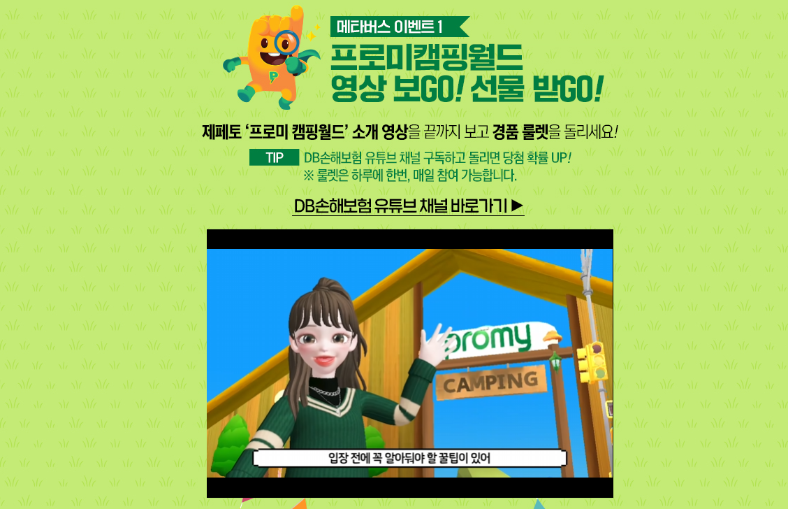 DB손해보험 메타버스 첫번째 이벤트는 제페토 프로미 캠핑월드 소개 영상을 끝까지 보고 경품 룰렛을 돌리는 프로미 캠핑월드 영상 보 GO! 선물 받GO! 이벤트입니다. 프로미월드 메타버스 캠핑을 떠나면 경품 룰렛을 돌리 수 있는 기회가 주어지는데요, 유튜브 채널을 구독하고 돌리면 당첨 확률이 높아집니다.