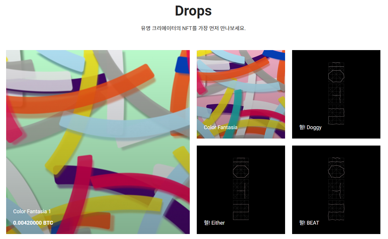 드롭스는 진행중인 NFT리스트를 확인하고 업비트 계좌 내 BTC로 입찰이 가능합니다. 고객확인 완료한 업비트 계정을 보유하고 있다면 누구나 구매할 수 있는데요, 각 드롭스에는 마감 시간이 정해져 있고, 주어진 기한 내 입찰을 통해 구매할 수 있습니다.